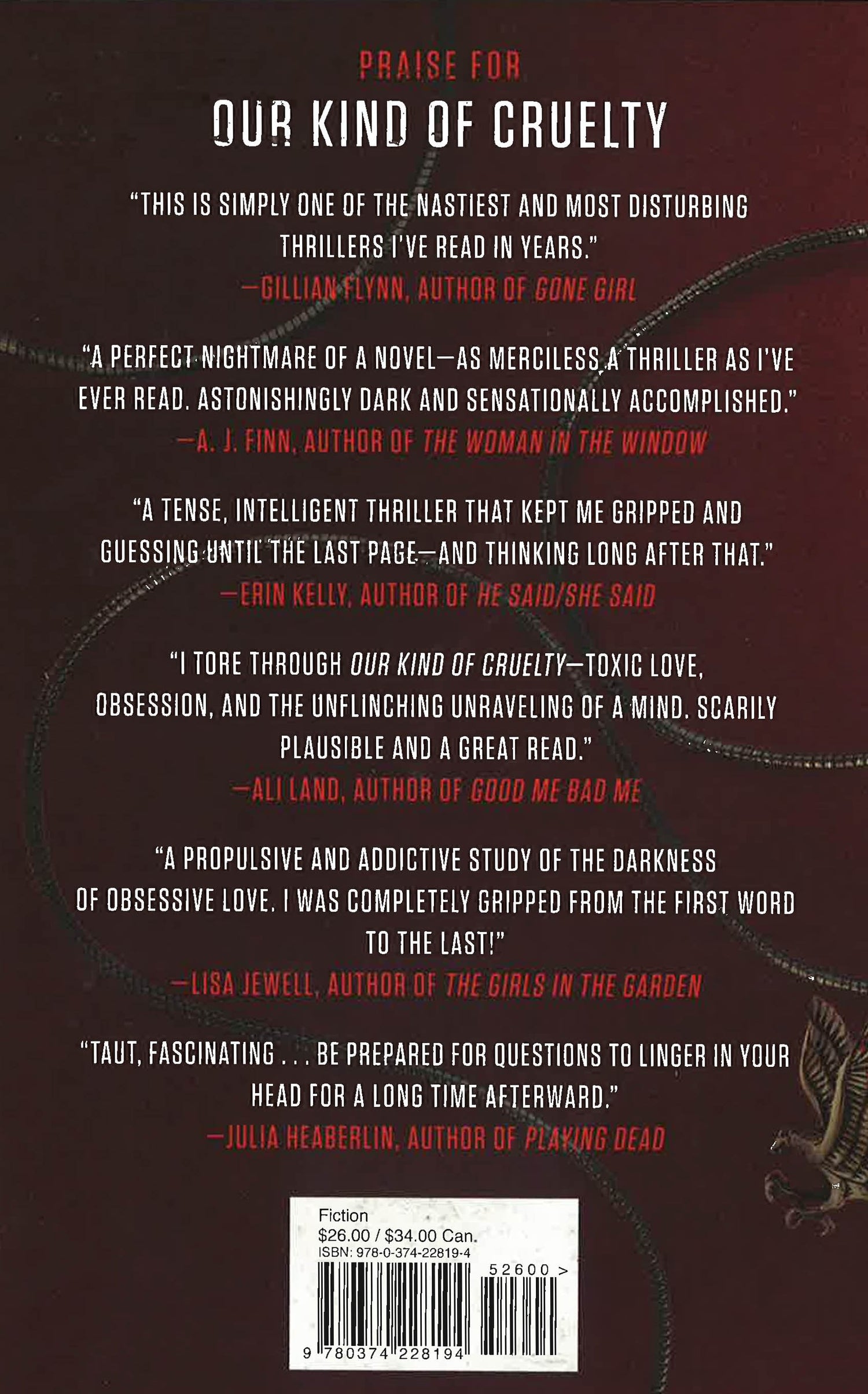 A spellbinding, darkly twisted novel about desire and obsession, and the complicated lines between truth and perception, Our Kind of Cruelty introduces Araminta Hall, a chilling new voice in psychological suspense.This is a love story. Mike’s love story.Mike Hayes fought his way out of a brutal childhood and into a quiet, if lonely, life before he met Verity Metcalf. V taught him about love, and in return, Mike has dedicated his life to making her happy. He’s found the perfect home, the perfect job; he’s sculpted himself into the physical ideal V has always wanted. He knows they’ll be blissfully happy together.