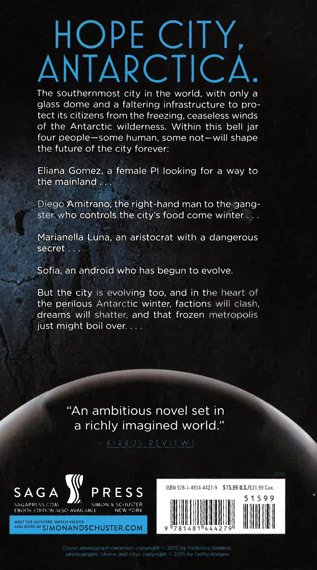 Hope City, Antarctica. The southernmost city in the world, with only a glass dome and a faltering infrastructure to protect its citizens from the freezing, ceaseless winds of the Antarctic wilderness. Within this bell jar four people - some human, some not - will shape the future of the city forever.