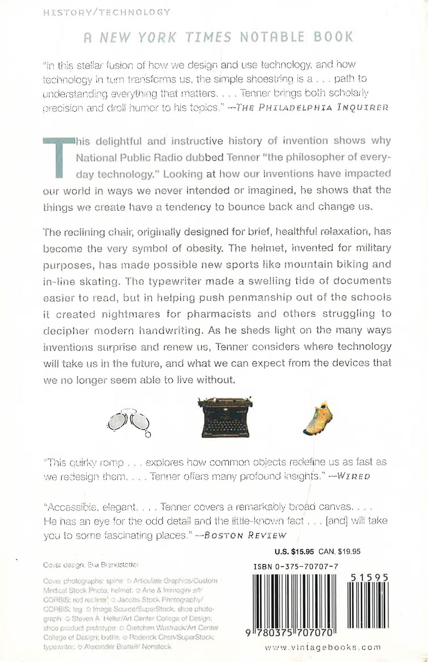 Once we step on the treadmill of progress, it's hard to step off. Yet Edward Tenner shows that human ingenuity can be applied in self-preservation as well, and he sheds light on the ways in which the users of commonplace technology surprise designers and engineers, as when early typists developed the touch method still employed on today's keyboards. And he offers concrete advice for reaping benefits from the devices that we no longer seem able to live without. Although dependent on these objects, we can also use them to liberate ourselves. This delightful and instructive history of invention shows why National Public Radio dubbed Tenner, "the philosopher of everyday technology."