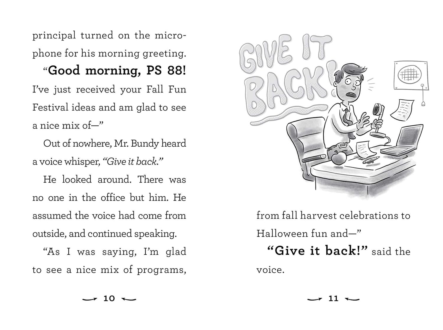 Acclaimed author Stephanie Calmenson turns fairy tales on their ears with the silly adventures about Principal Bundy. In this Mr. Bundy (mis)adventure, PS 88’s beloved principal hears loud voices, but doesn’t know where they are coming from. Could there be an invisible man on the loose? Or even a ghost in the halls of PS 88?