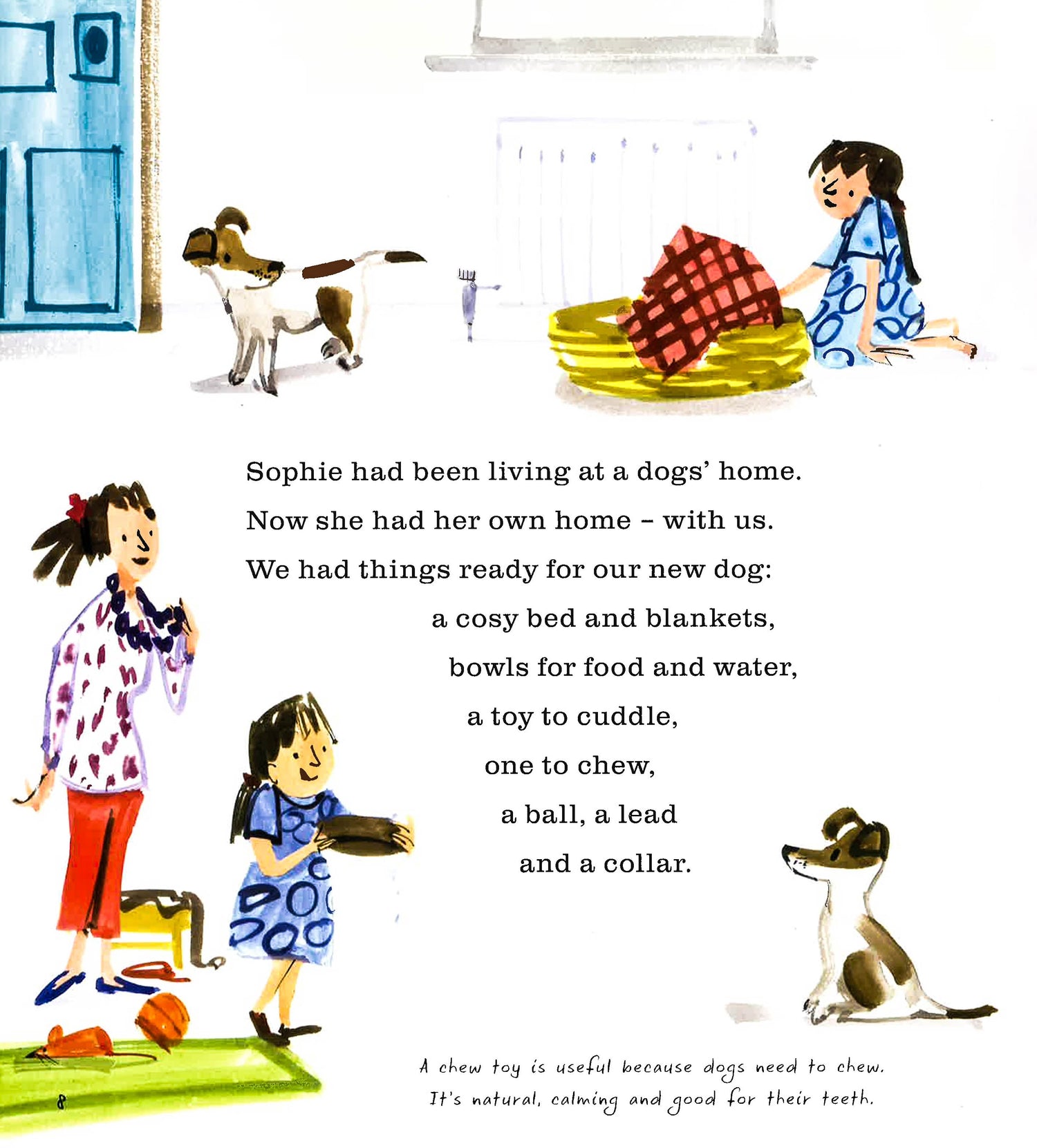 A delightful Nature Storybook about a rescue dog, packed with useful information and charmingly illustrated by Salvatore Rubbino.With charming illustrations from Salvatore Rubbino, this delightful non-fiction picture book tells the story of a rescue dog. Sophie is a boisterous and lovable Jack Russell, brought home from a rescue centre. The book follows her delightful adventures: join Sophie and her new family as she learns how to respond how to orders such as "sit" and "stay", is taken for walks in the park where she encounters other dogs and accidentally wins a dog show! The smaller caption text gives readers information about feeding and grooming your dog, different dog breeds, communication and training, and how dogs respond to human voices. The back matter includes a helpful index and bibliography.