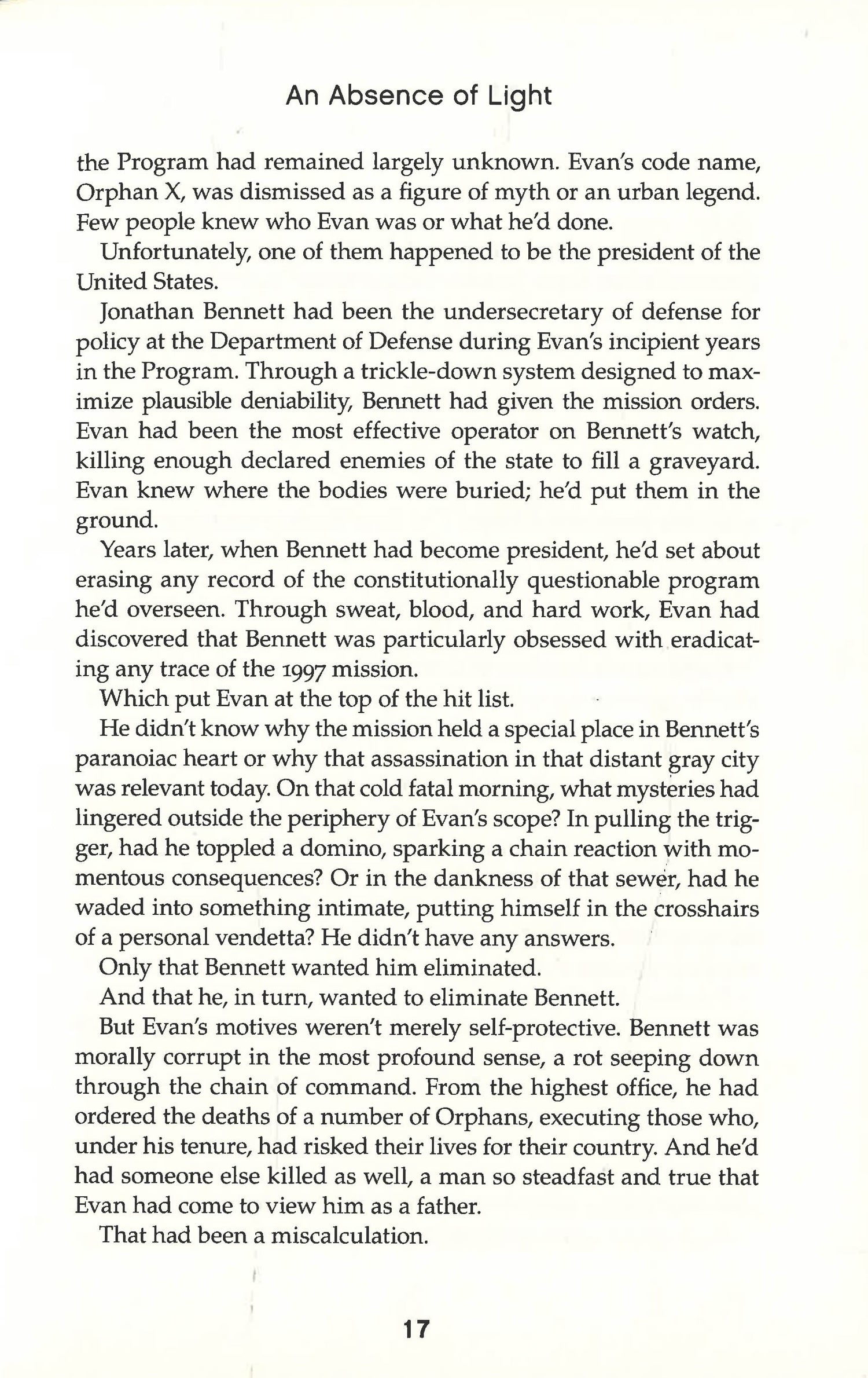 Someone at the very highest level of government has been trying to eliminate every trace of the Orphan Program by killing all the remaining Orphans and their trainers. After Evan's mentor and the only father he ever knew was killed, he decided to strike back. His target is the man who started the Program and who is now the most heavily guarded person in the world: the President of the United States.