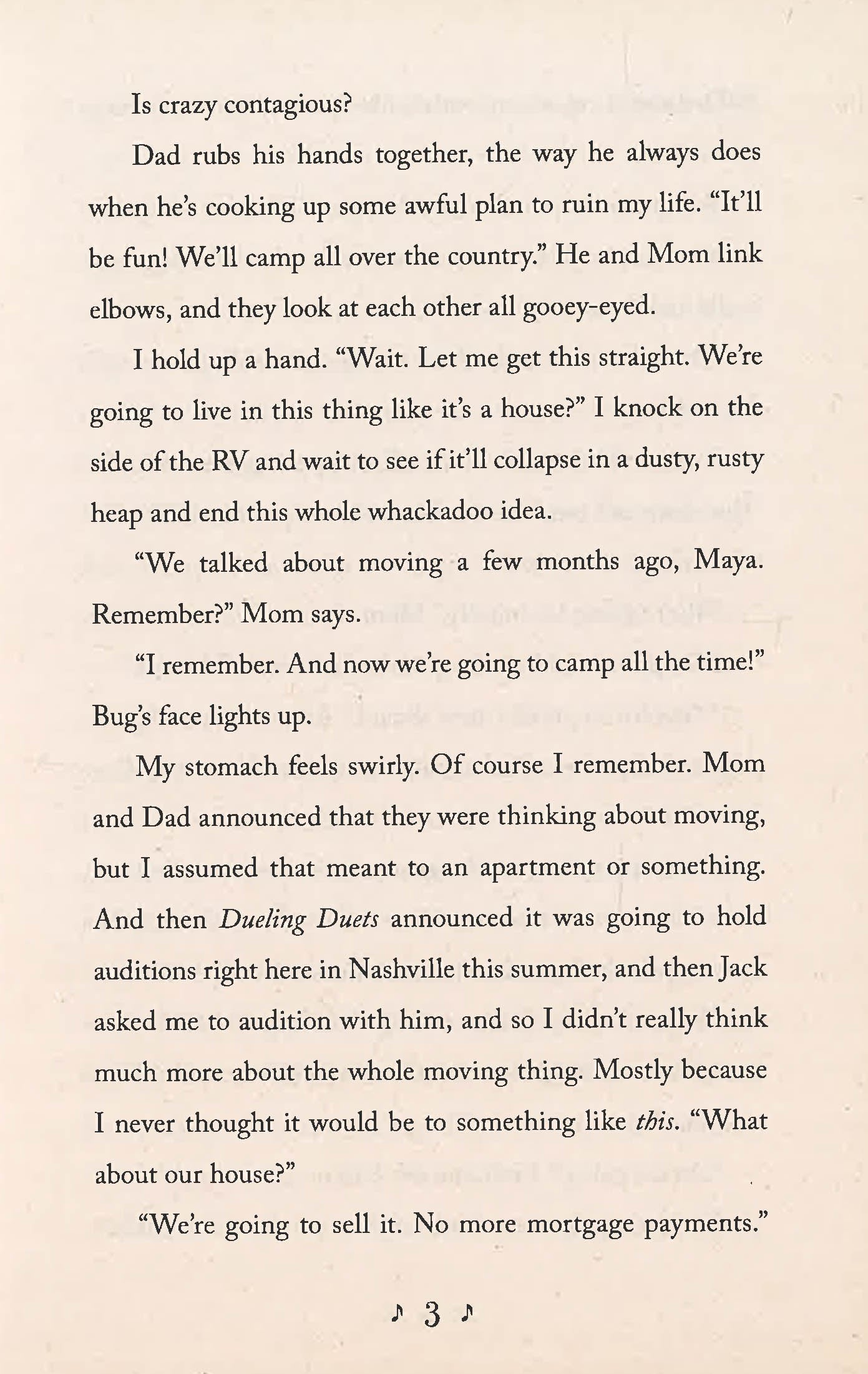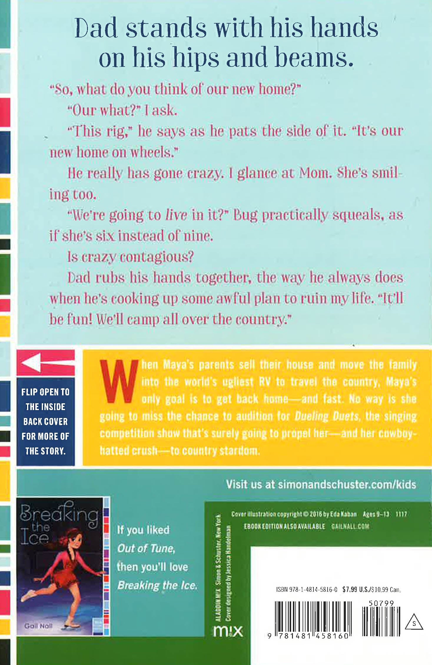 A country music hopeful puts her Nashville dreams on hold when she moves into an RV to travel across the country with her family in this charming M!X novel from the author of Breaking the Ice. When twelve-year-old Maya's parents sell their house and move the family into the world's ugliest RV to travel the country, Maya's only goal is to get back home--and fast. No way is she going to miss the chance to audition for Dueling Duets, the singing competition show that's going to surely propel her--and her cowboy-hatted crush--to country stardom. Operation Maya Goes Home, or OMGH, turns out to be more complicated than she had expected, so Maya sets out on a secret one-day, one-hundred-mile bike ride through Yellowstone National Park with her know-it-all little sister, a cute nature boy, and blue-haired, earbud-addicted Shiver (a.k.a. the most annoying girl ever). Somewhere between the worst muscle ache she's ever experienced and losing half of their group to a flat tire, Maya starts wondering if maybe, just maybe, it's possible to find home in the last place you expected.