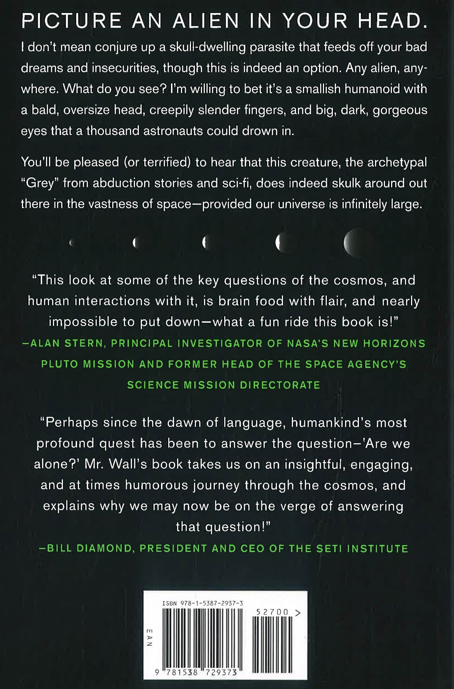 We've all asked ourselves the question. It's impossible to look up at the stars and NOT think about it: Are we alone in the universe? Books, movies and television shows proliferate that attempt to answer this question and explore it. In OUT THERE Space.com senior writer Dr. Michael Wall treats that question as merely the beginning, touching off a wild ride of exploration into the final frontier. He considers, for instance, the myriad of questions that would arise once we do discover life beyond Earth (an eventuality which, top NASA officials told Wall, is only drawing closer). What would the first aliens we meet look like? Would they be little green men or mere microbes? Would they be found on a planet in our own solar system or orbiting a star far, far away? Would they intend to harm us, and if so, how might they do it? And might they already have visited?