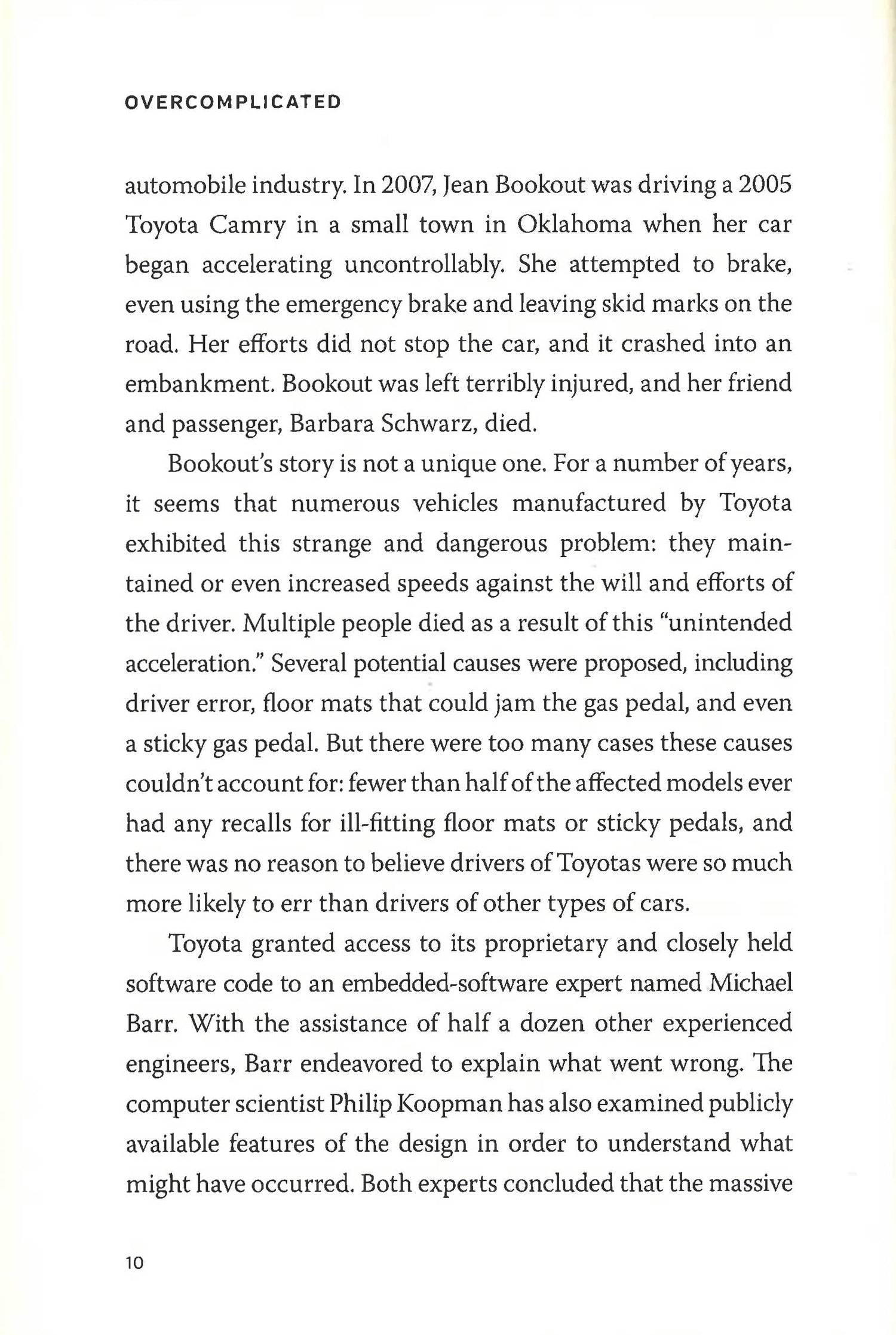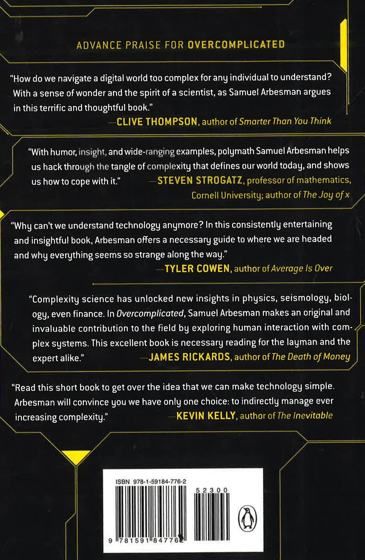Why did the New York Stock Exchange suspend trading without warning on July 8, 2015? Why did certain Toyota vehicles accelerate uncontrollably against the will of their drivers? Why does the programming inside our airplanes occasionally surprise its creators? After a thorough analysis by the top experts, the answers still elude us. You don't understand the software running your car or your iPhone. But here's a secret: neither do the geniuses at Apple or the Ph.D.'s at Toyota--not perfectly, anyway. No one, not lawyers, doctors, accountants, or policy makers, fully grasps the rules governing your tax return, your retirement account, or your hospital's medical machinery. The same technological advances that have simplified our lives have made the systems governing our lives incomprehensible, unpredictable, and overcomplicated. In Overcomplicated, complexity scientist Samuel Arbesman offers a fresh, insightful field guide to living with complex technologies that defy human comprehension. As technology grows more complex, Arbesman argues, its behavior mimics the vagaries of the natural world more than it conforms to a mathematical model. If we are to survive and thrive in this new age, we must abandon our need for governing principles and rules and accept the chaos. By embracing and observing the freak accidents and flukes that disrupt our lives, we can gain valuable clues about how our algorithms really work. What's more, we will become better thinkers, scientists, and innovators as a result. Lucid and energizing, this book is a vital new analysis of the world heralded as "modern" for anyone who wants to live wisely.