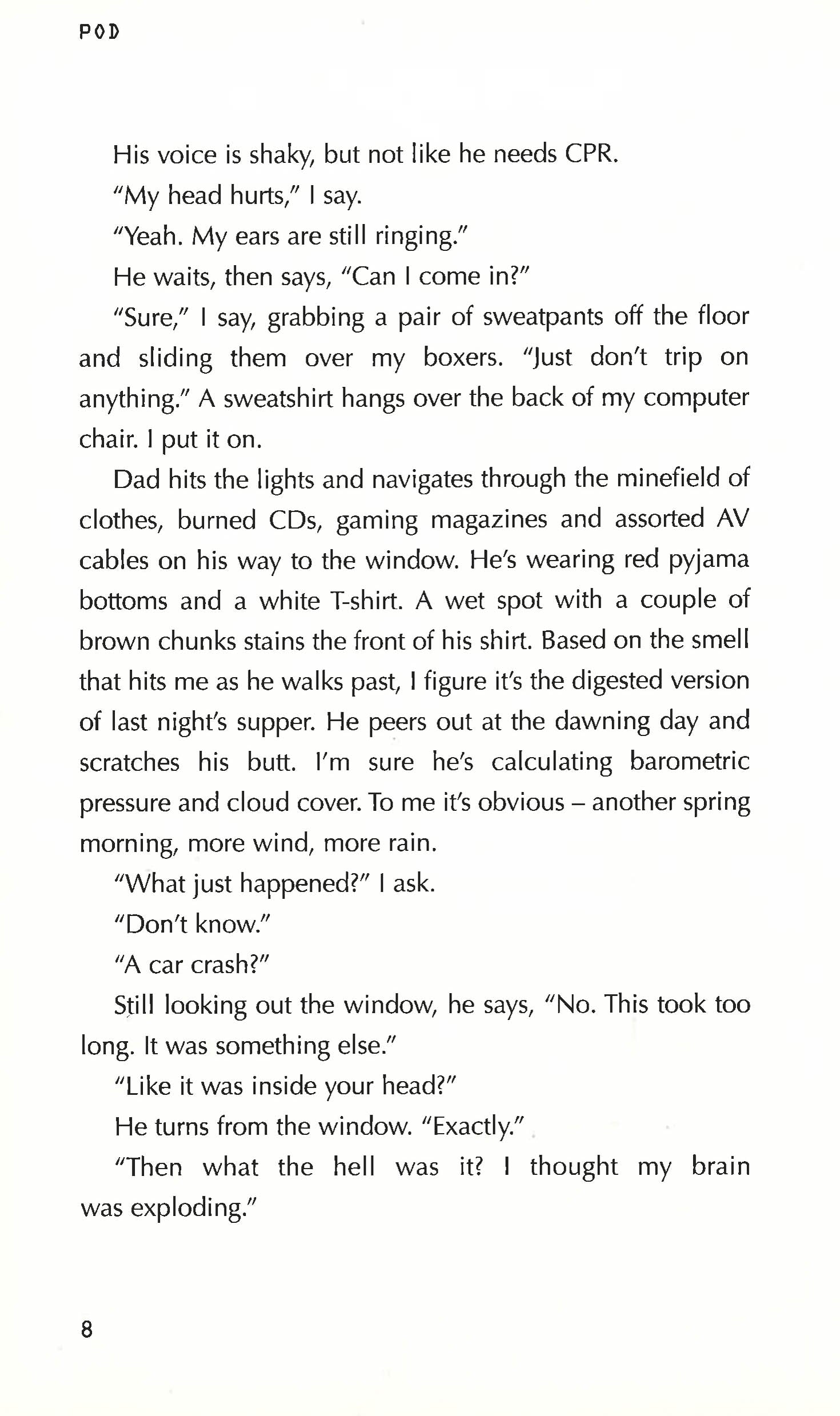 POD's - strange alien spheres hover menacingly in the sky, zapping anyone who ventures outside. Will is 15 and stuck in his house with his OCD dad. They're running out of food...Megs is 12, alone and trapped in a multi-storey carpark. The hotel next door is under the control of dangerous security staff, but Megs has something they want, and they'll do anything to get it...When the aliens invade, the real enemy becomes humanity itself. What would you do to survive?
