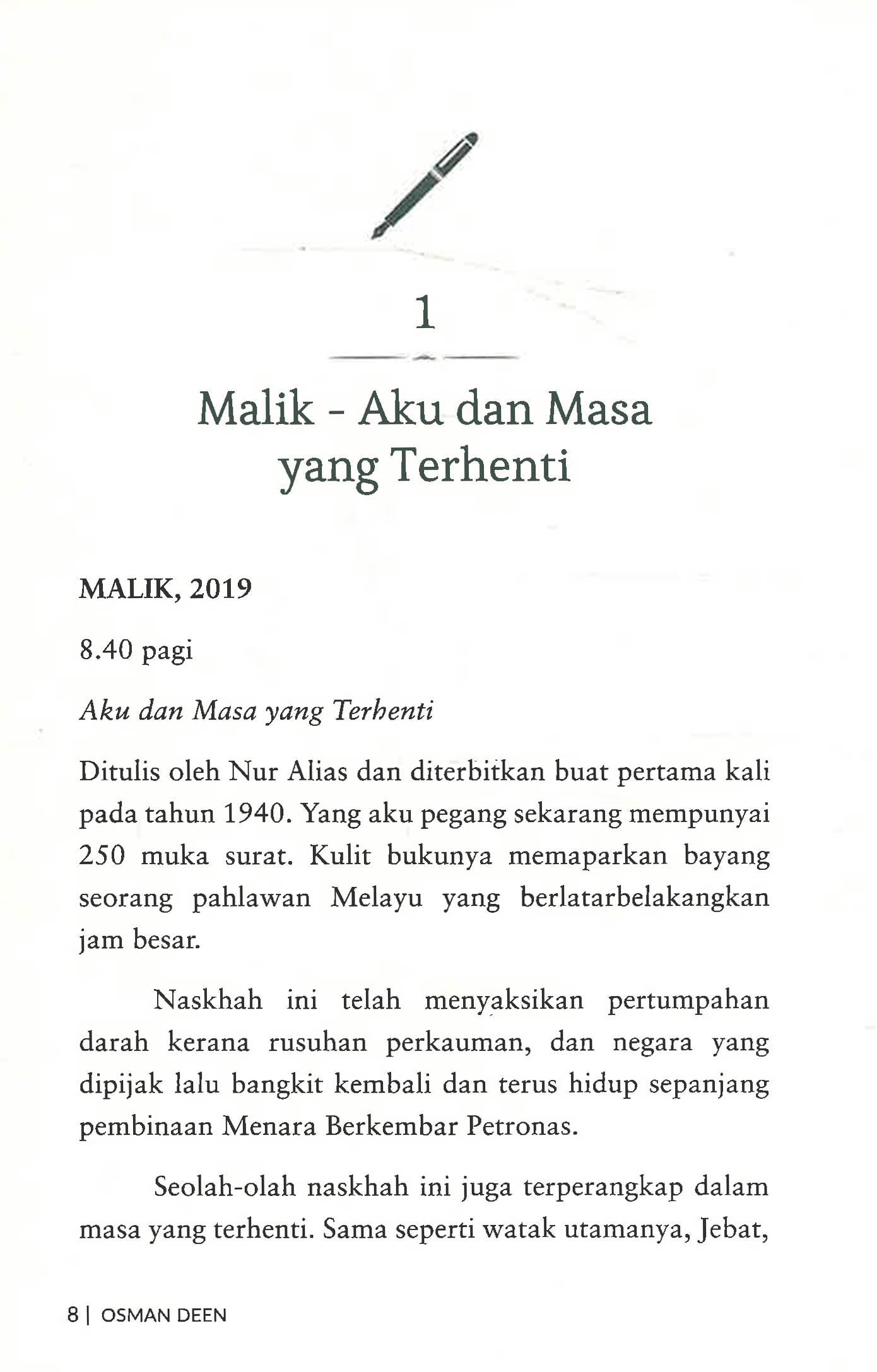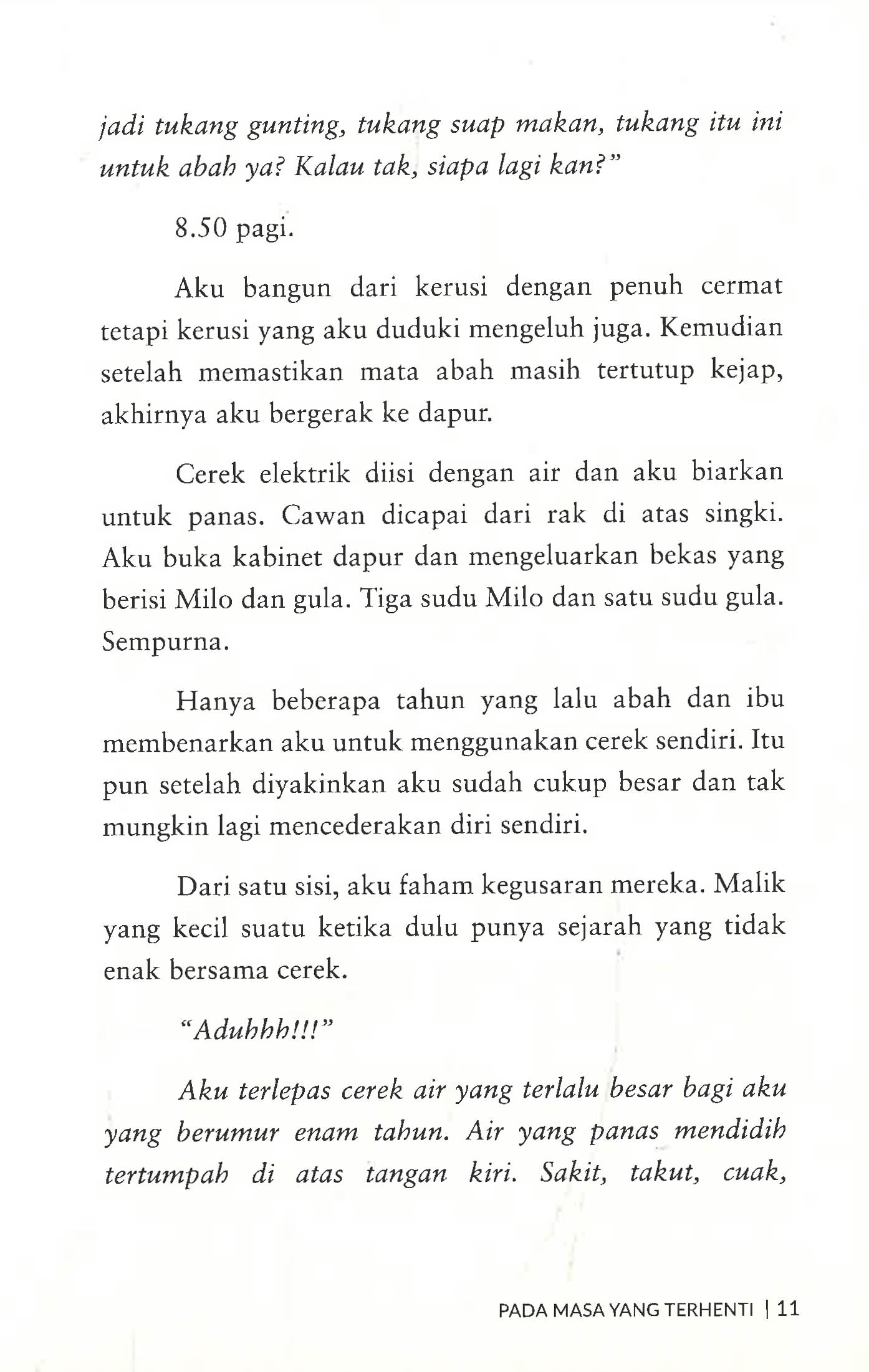 Malik terdesak — kerana dia tahu, waktu abah semakin singkat. Dia kasihan melihat ibu yang lelah bekerja dan menjaga abah. Walau sebanyak mana pun Malik cuba meringankan derita mereka, masih tidak cukup. Jarum masa tetap berdetik.