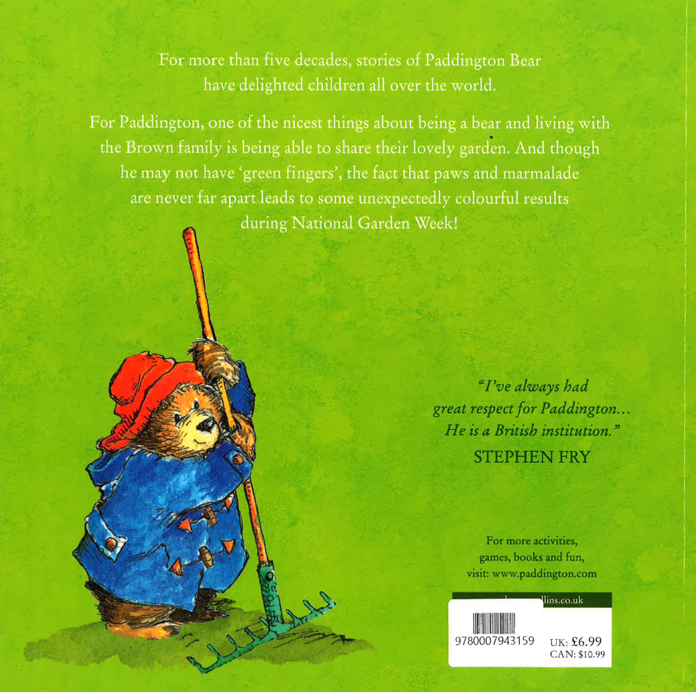 For Paddington, one of the nicest things about being a bear and living with the Brown family is being able to share their lovely garden. But gardens don't just happen, and the one at number thirty-two Windsor Gardens keeps the whole family busy, so Paddington is only too pleased to lend a paw when they give him a chance. He may not have 'green fingers', but the fact that paws and marmalade are never far apart leads to some unexpectedly colourful results during National Garden Week!