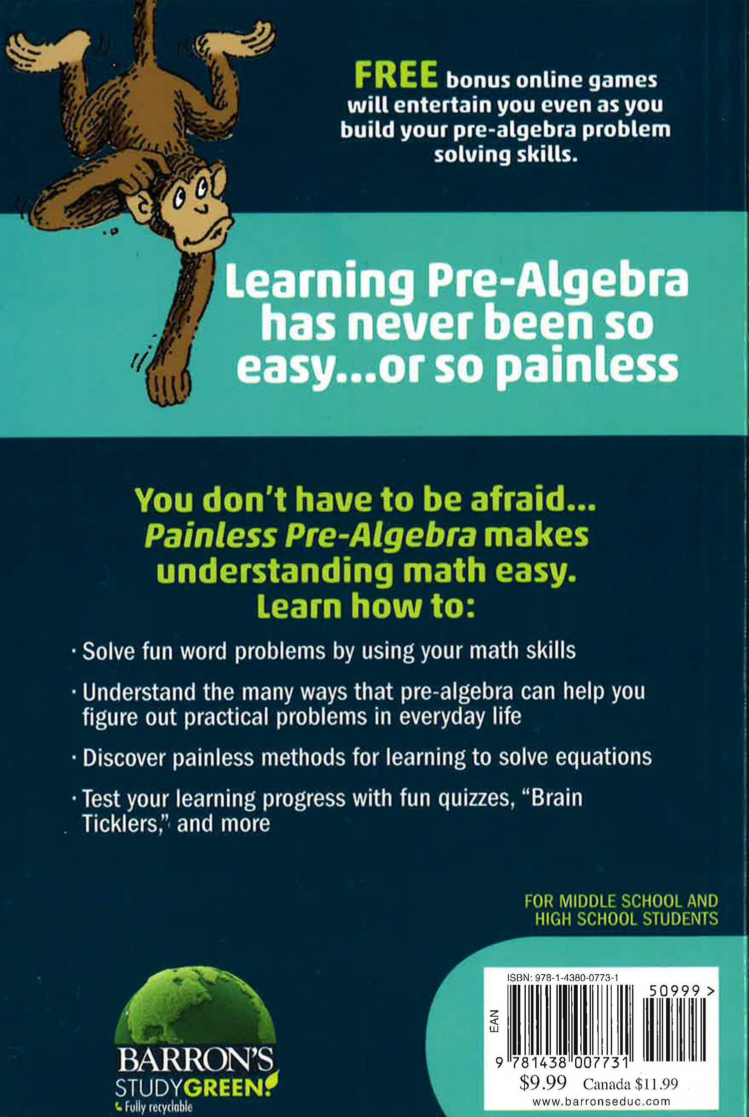 Teaches basic algebra, exponents and roots, equations and inequalities, and polynomials. Titles in Barron's extensive Painless Series cover a wide range of subjects, as they are taught at middle school and high school levels. Perfect for supporting Common Core Standards, these books are written for students who find the subjects somewhat confusing, or just need a little extra help. Most of these books take a lighthearted, humorous approach to their subjects, and offer fun exercises including puzzles, games, and challenging "Brain Tickler" problems to solve. Bonus Online Component: includes additional games to challenge students, including Beat the Clock, a line match game, and a word scramble.
