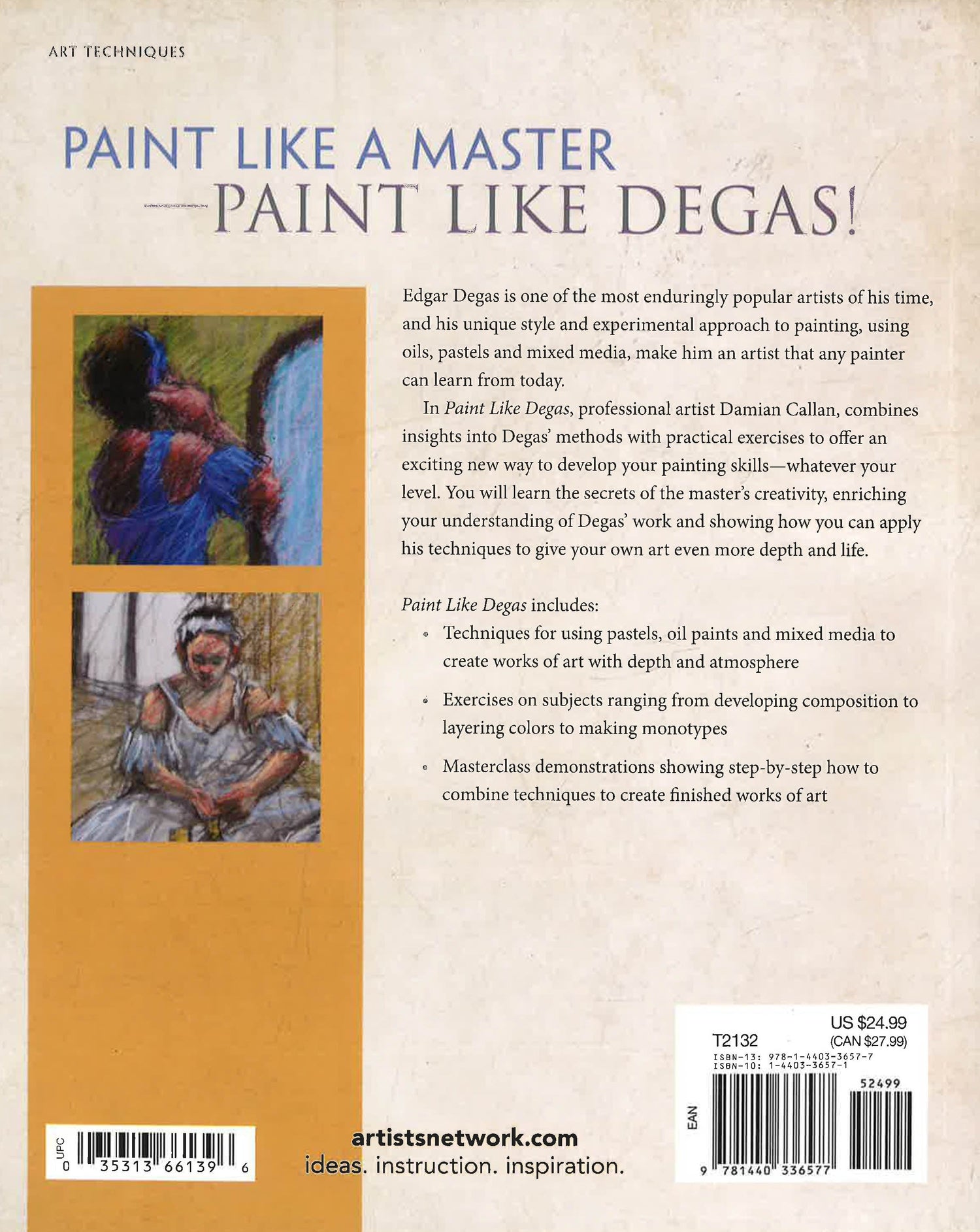 Paint Like a Master--Paint Like Degas! Edgar Degas is one of the most enduringly popular artists of his time, and his unique style and experimental approach to painting, using oils, pastels and mixed media, make him an artist that any painter can learn from today. In Paint Like Degas, professional artist Damian Callan, combines insights into Degas' methods with practical exercises to offer an exciting new way to develop your painting skills--whatever your level. You will learn the secrets of the master's creativity, enriching your understanding of Degas' work and showing how you can apply his techniques to give your own art even more depth and life. Paint Like Degas includes: Techniques for using pastels, oil paints and mixed media to create works of art with depth and atmosphere Exercises on subjects ranging from developing composition to layering colours to making monotypes Masterclass demonstrations showing step-by-step how to combine techniques to create finished works of art