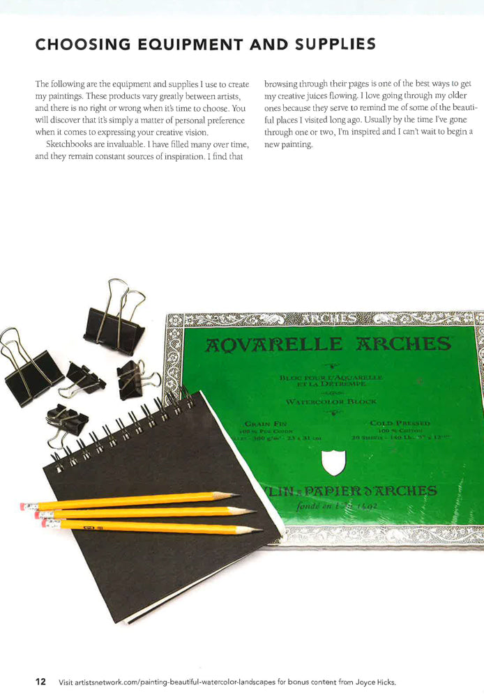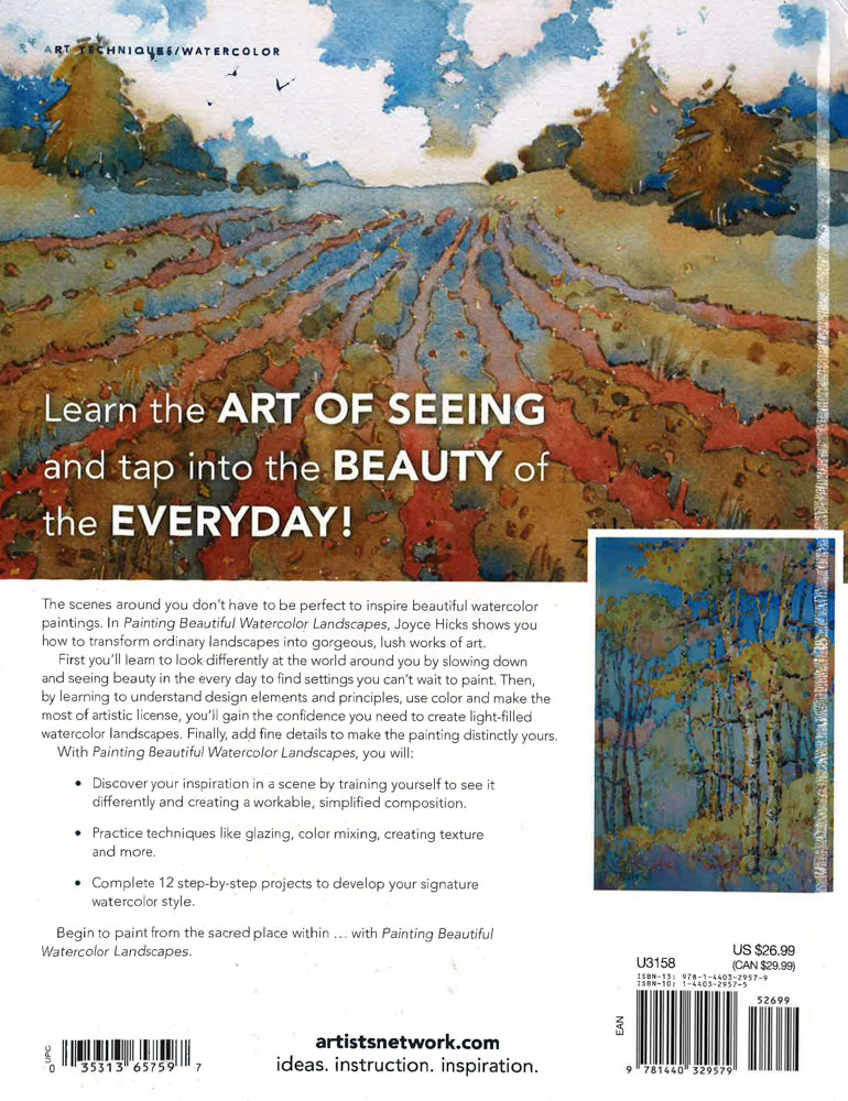 The scenes around you don't have to be perfect to inspire beautiful watercolor paintings. In Painting Beautiful Watercolor Landscapes, Joyce Hicks shows you how to transform ordinary landscapes into gorgeous, lush works of art.Learn the Art of Seeing and tap into the beauty of the everyday! The scenes around you don't have to be perfect to inspire beautiful watercolor paintings. In Painting Beautiful Watercolor Landscapes, Joyce Hicks shows you how to transform ordinary landscapes into gorgeous, lush works of art. First you'll learn to look differently at the world around you by slowing down and seeing beauty in the every day to find settings you can't wait to paint. Then, by learning to understand design elements and principles, use color and make the most of artistic license, you'll gain the confidence you need to create light-filled watercolor landscapes. Finally, Joyce shows you how to add fine details to make the painting distinctly yours. With Painting Beautiful Watercolor Landscapes, you will:Discover your inspiration in a scene by training yourself to see it differently and creating a workable simplified composition.Practice techniques like glazing, color mixing, developing an inviting composition and more.Complete 12 step-by-step projects to create you signature watercolor style. Begin to paint from the sacred place within...with Painting Beautiful Watercolor Landscapes.