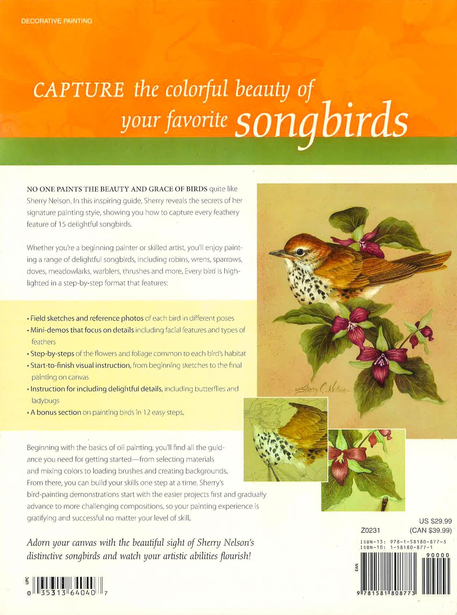 Capture the colorful beauty of your favorite songbirds! No one paints the beauty and grace of birds quite like Sherry Nelson. In this inspiring guide, Sherry reveals the secrets of her signature painting style, showing you how to capture every feathery feature of 15 delightful songbirds. Whether you're a beginning painter or skilled artist, you'll enjoy painting a range of delightful songbirds, including robins, wrens, sparrows, doves, meadowlarks, warblers, thrushes and more. Every bird is highlighted in a step-by-step format that features: - Field sketches and reference photos of each bird in different poses - Mini-demos that focus on details including facial features and types of feathers - Step-by-steps of the flowers and foliage common to each bird's habitat - Start-to-finish visual instruction, from beginning sketches to the final painting on canvas - Instruction for including delightful details, including butterflies and ladybugs - A bonus section on painting birds in 12 easy steps. Beginning with the basics of oil painting, you'll find all the guidance you need for getting started?from selecting materials and mixing colors to loading brushes and creating backgrounds. From there, you can build your skills one step at a time. Sherry's bird-painting demonstrations start with the easier projects first and gradually advance to more challenging compositions, so your painting experience is gratifying and successful no matter your level of skill. Adorn your canvas with the beautiful sight of Sherry Nelson's distinctive songbirds and watch your artistic abilities flourish.