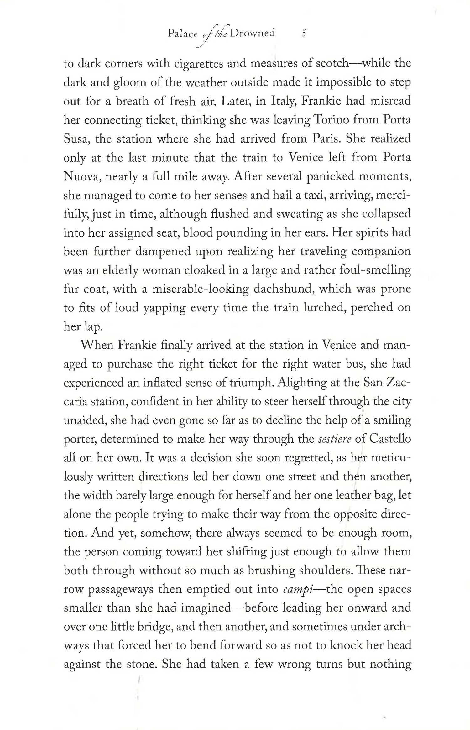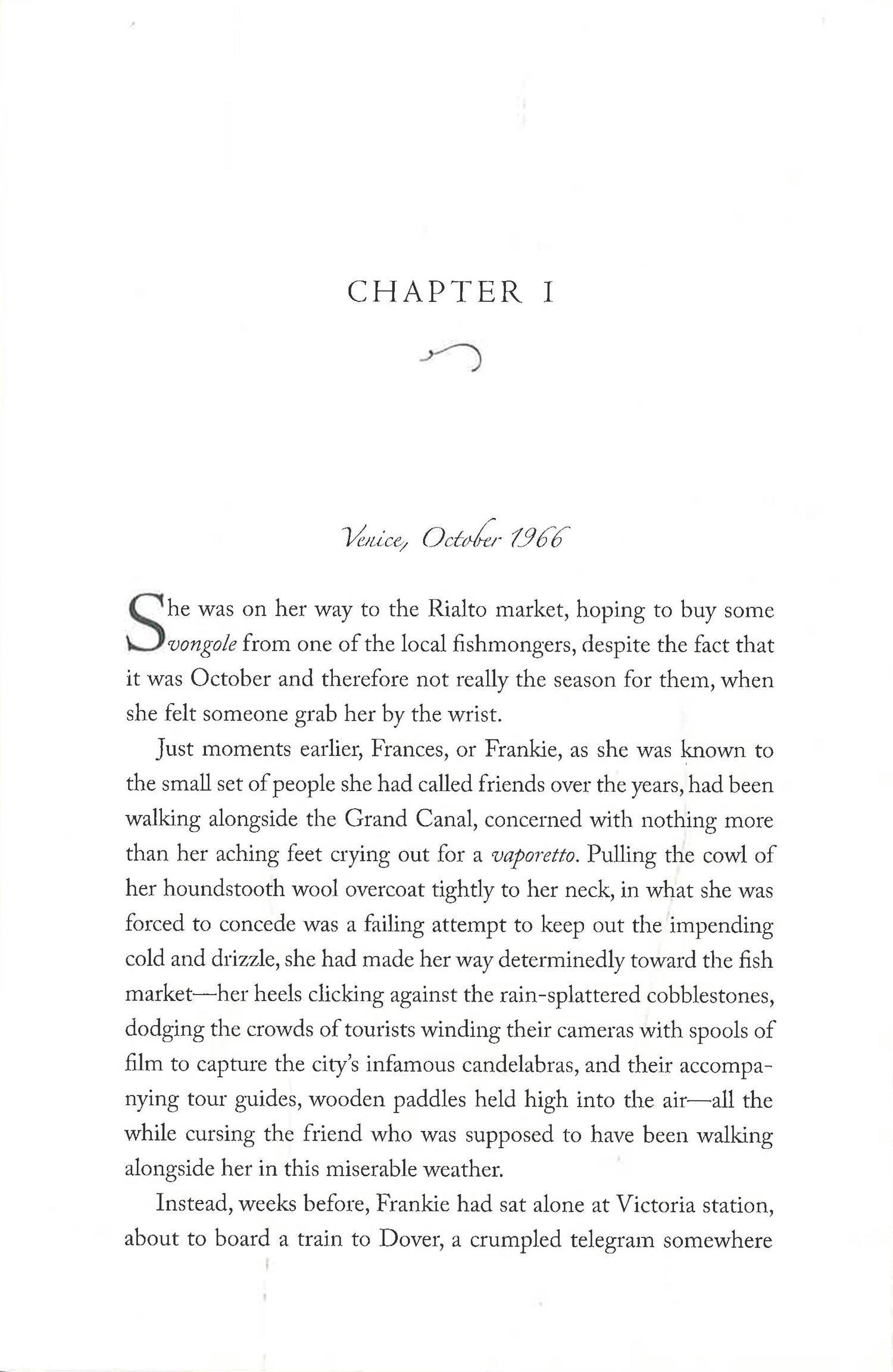 Then Gilly appears. A precocious young admirer eager to make friends, Gilly seems determined to insinuate herself into Frankie's solitary life. But there's something about the young woman that gives Frankie pause. How much of what Gilly tells her is the truth? As a series of lies and revelations emerge, the lives of these two women will be tragically altered as the catastrophic 1966 flooding of Venice ravages the city.