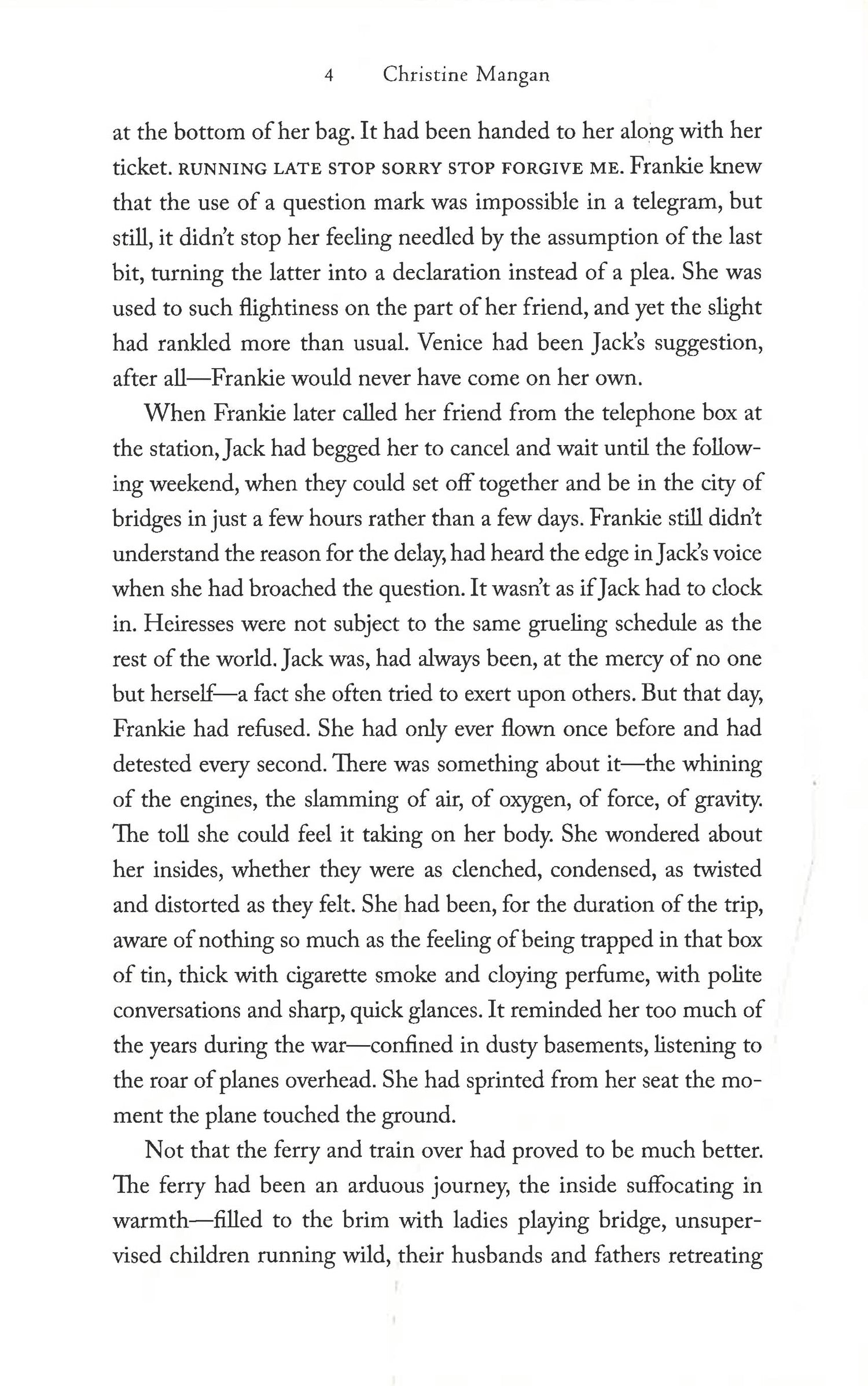 It's 1966 and Frankie Croy retreats to her friend's vacant palazzo in Venice. Years have passed since the initial success of Frankie's debut novel and she has spent her career trying to live up to the expectations. Now, after a particularly scathing review of her most recent work, alongside a very public breakdown, she needs to recharge and get re-inspired.