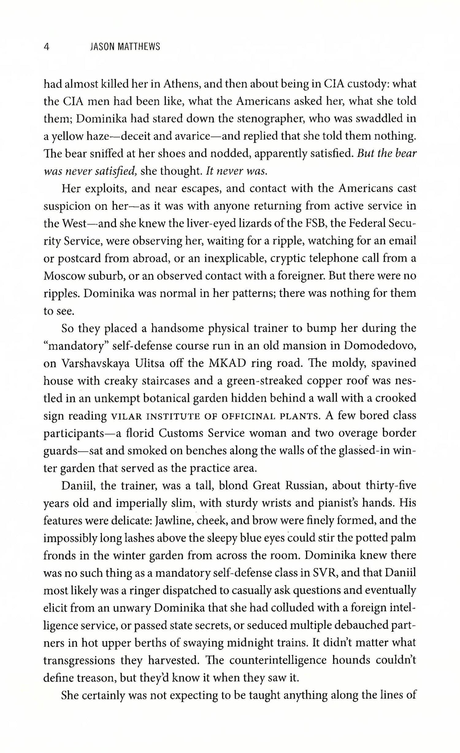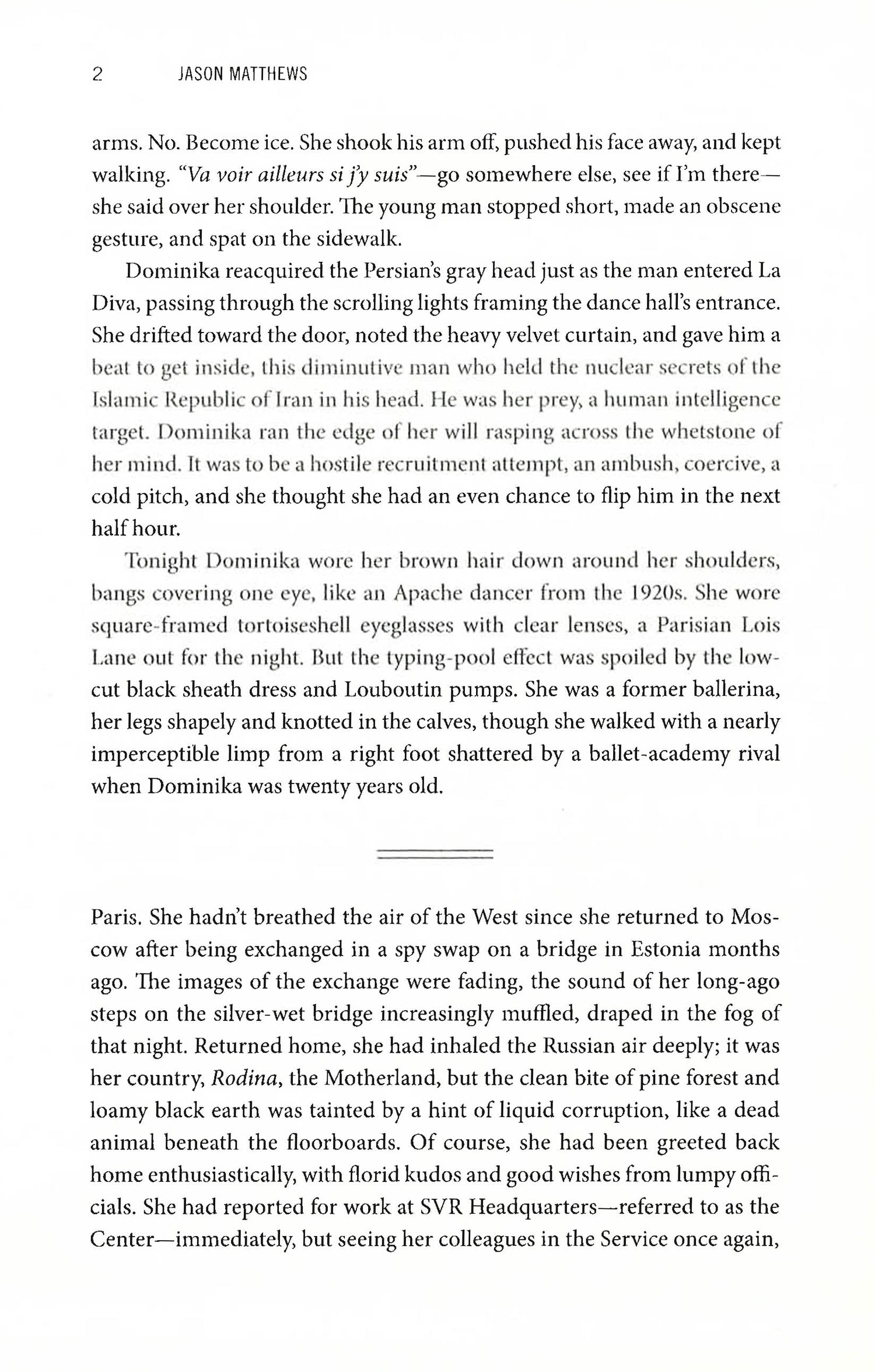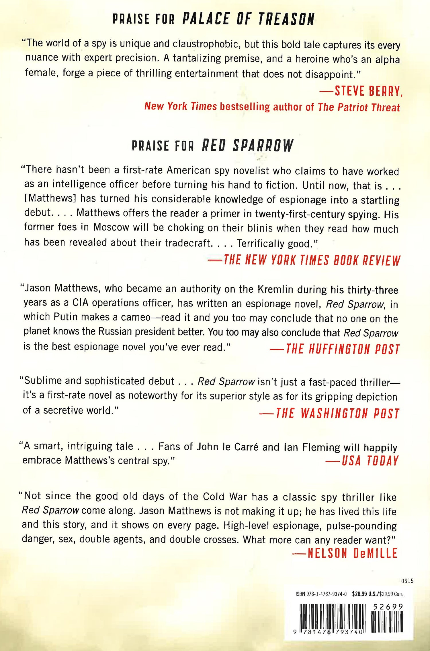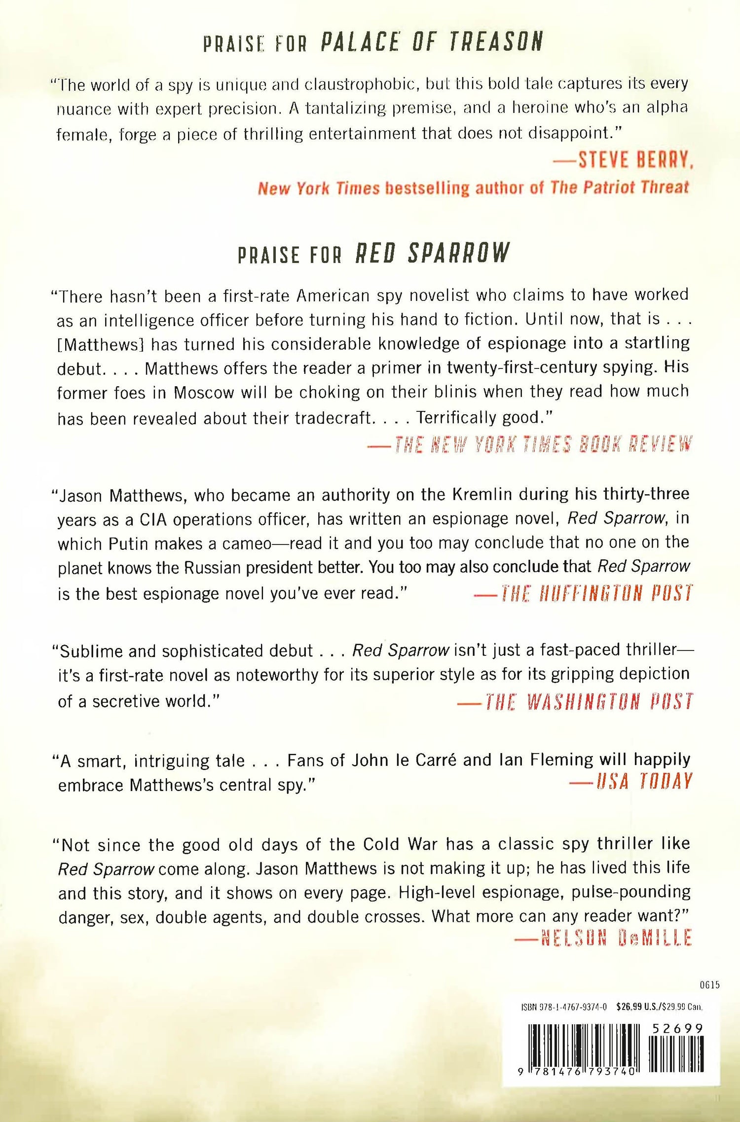 From the bestselling, Edgar Award-winning author of the "terrifically good" ( The New York Times ) Red Sparrow, a compulsively readable new novel about star-crossed Russian agent Dominika Egorova and CIA's Nate Nash in a desperate race to the finish. Captain Dominika Egorova of the Russian Intelligence Service (SVR) has returned from the West to Moscow. She despises the men she serves, the oligarchs, and crooks, and thugs of Putin's Russia. What no one knows is that Dominika is working for the CIA as Washington's most sensitive penetration of SVR and the Kremlin. As she expertly dodges exposure, Dominika deals with a murderously psychotic boss; survives an Iranian assassination attempt; escapes a counterintelligence ambush; rescues an arrested agent and exfiltrates him out of Russia; and has a chilling midnight conversation in her nightgown with President Putin. Complicating these risks is the fact that Dominika is in love with her CIA handler, Nate Nash, and their lust is as dangerous as committing espionage in Moscow. And when a mole in the SVR finds Dominika's name on a restricted list of sources, it is a virtual death sentence... Just as fast-paced, heart-pounding, and action-packed as Red Sparrow , Jason Matthews's second novel confirms he is "an insider's insider...and a masterful storyteller" (Vince Flynn, #1 New York Times bestselling author).