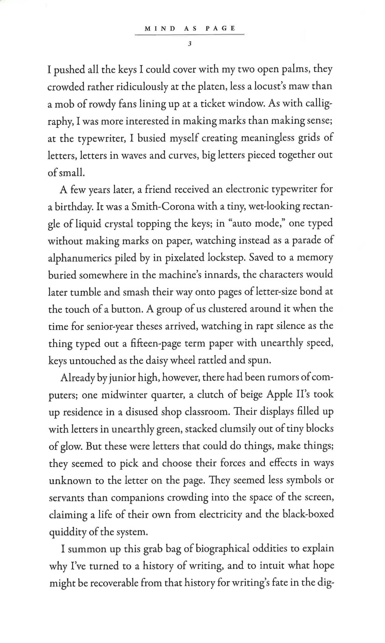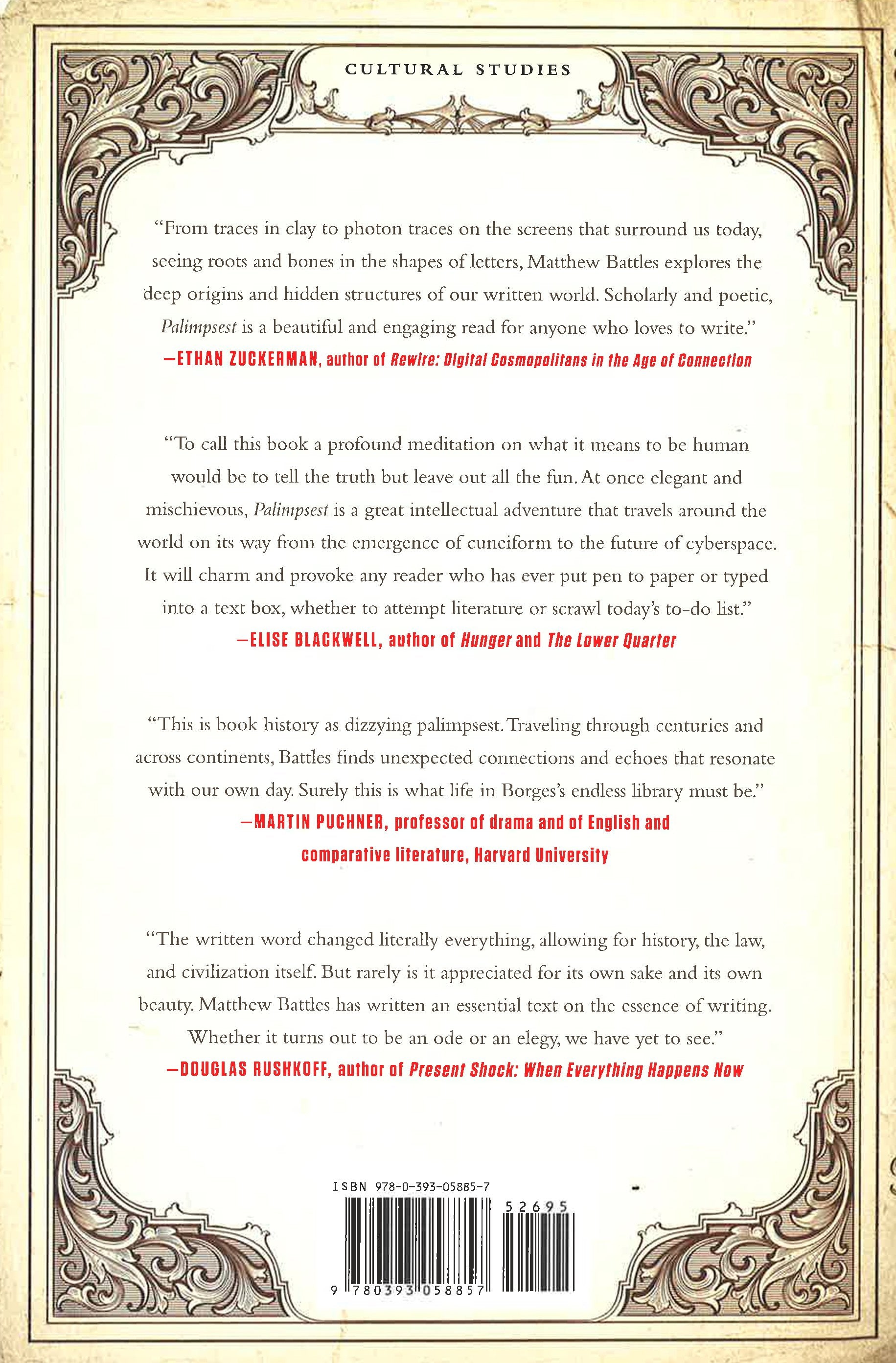 Matthew Battles explores the questions of why writing exists and what it means to those who write. Born from the interplay of natural and cultural history, the seemingly magical act of writing has continually expanded our consciousness. It has been used as both an instrument of power and a channel of the divine; a means of social bonding and of individual self-definition. Now, as the revolution once wrought by the printed word gives way to the digital age, many fear that the art of writing-and the nuanced thinking nurtured by writing-are under threat. But writing itself, despite striving for permanence, is always in the midst of growth and transfiguration. Celebrating the impulse to record, to invent, to make one's mark, Battles re-enchants the written word for all those susceptible to the power and beauty of writing in all its forms.