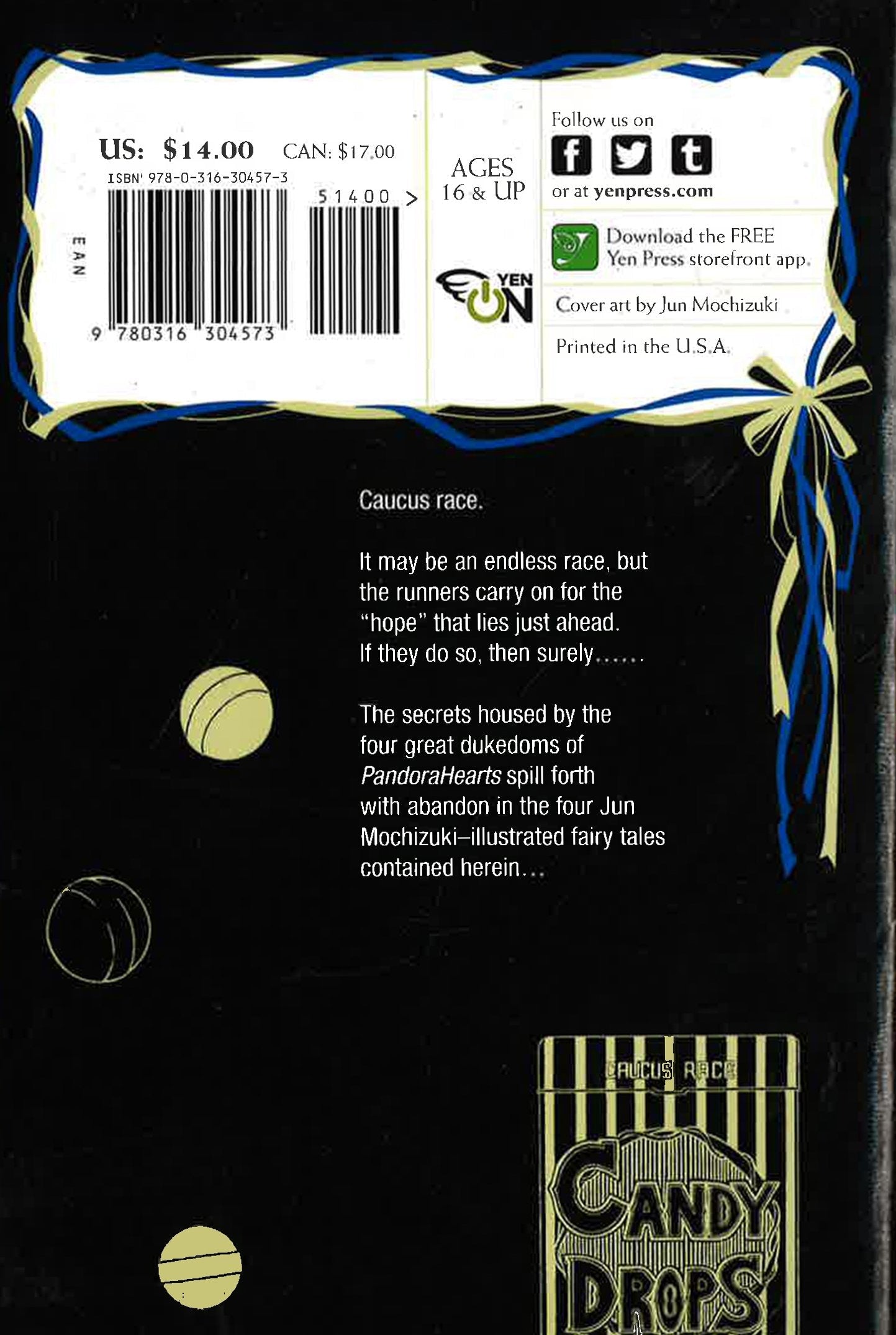 Caucus race.It may be an endless race, but the runners carry on for the 'hope' that lies just ahead. If they do so, then surely......The secrets housed by the four great dukedoms of PandoraHearts spill forth with abandon in the four Jun Mochizuki-illustrated fairy tales contained herein...