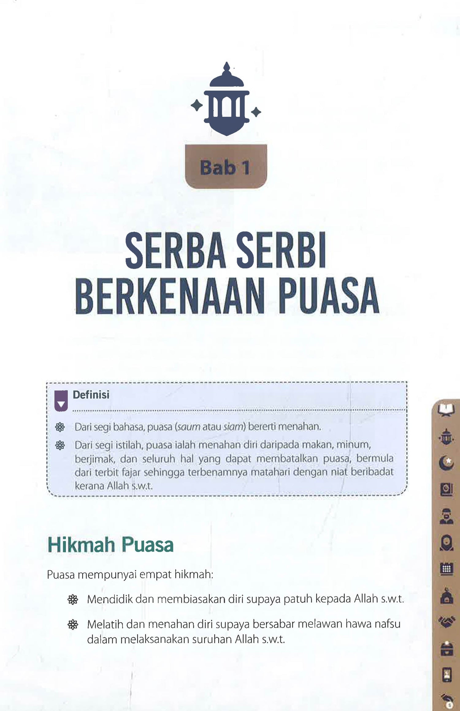 “Sesiapa yang berpuasa satu hari, Allah s.w.t. akan menjauhkannya daripada api neraka sejauh 70 musim.†(Hadith direkodkan oleh Al-Bukhari dan Muslim) Ibadah puasa adalah satu-satunya ibadah yang tidak dapat diperlihatkan dengan zahir. Perlaksanaannya melibatkan niat dan kejujuran Muslim itu sendiri. Walaupun ia kelihatan mudah, beberapa peraturan dan syarat mengikatnya sebagai pemelihara kemuliaan ibadah puasa. Keagungan ibadah puasa begitu tinggi sehingga dinamakan sebuah syurga khusus buat mereka yang gemar berpuasa dan puasanya diterima, syurga ar-Rayyan. Selain itu, ibadah puasa juga menyajikan ganjaran dalam pelbagai aspek lagi seperti kesihatan dan kecergasan. Langkah demi langkah berpuasa dituliskan dalam buku ini sebagai panduan teratur buat semua yang mahu melaksanakan ibadah puasa, sama ada puasa sunat ataupun puasa wajib. Semoga puasa kita diterima Allah.