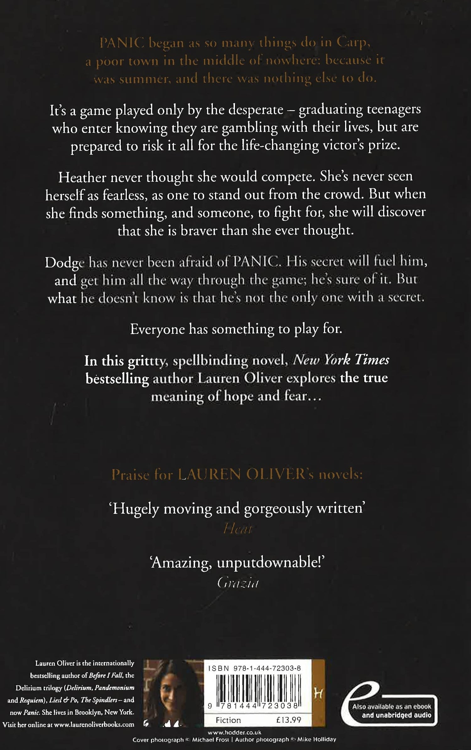 An utterly gripping thriller from bestselling author Lauren Oliver. Soon to be a major Amazon Prime Video series.An utterly gripping thriller from bestselling author Lauren Oliver. Panic began as so many things do in Carp, a poor town of twelve thousand people in the middle of nowhere: because it was summer, and there was nothing else to do.Heather never thought she would compete in panic, a legendary game played by graduating seniors, where the stakes are high and the payoff is even higher. She'd never thought of herself as fearless, the kind of person who would fight to stand out. But when she finds something, and someone, to fight for, she will discover that she is braver than she ever thought.Dodge has never been afraid of panic. His secret will fuel him, and get him all the way through the game; he's sure of it. But what he doesn't know is that he's not the only one with a secret. Everyone has something to play for.For Heather and Dodge, the game will bring new alliances, unexpected revelations, and the possibility of first love for each of them-and the knowledge that sometimes the very things we fear are those we need the most.In this gritty, spellbinding novel, bestselling author Lauren Oliver delivers a gripping narrative of friendship, courage, survival, and hope.