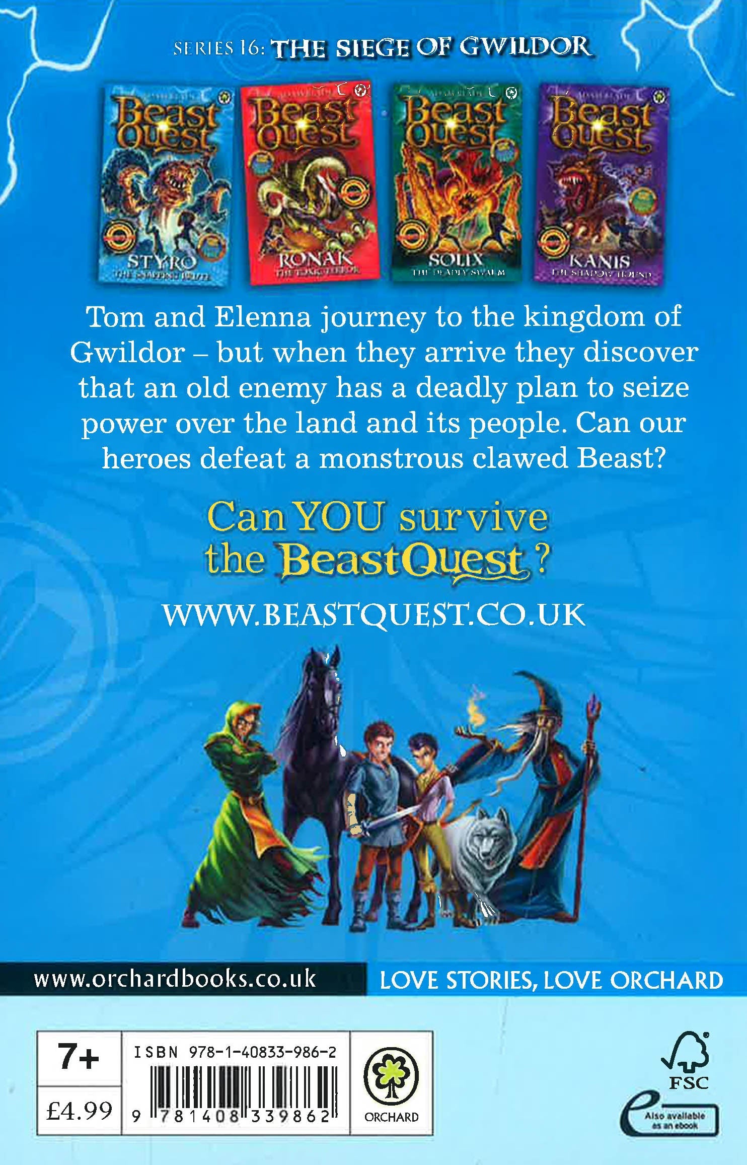 Battle fearsome beasts and fight evil with Tom and Elenna in the bestselling adventure series for boys and girls aged 7 and up.Tom and Elenna journey to the kingdom of Gwildor - but when they arrive they discover that an old enemy has a deadly plan to seize power over the land and its people. Can our heroes defeat a monstrous clawed lobster Beast?There are FOUR thrilling adventures to collect in the Beast Quest: The Siege of Gwildow series: Styro the Snapping Brute; Ronak the Toxic Terror; Solix the Deadly Swarm; Kanis the Shadow Hound.If you like Beast Quest, check out Adam Blade's other series: Team Hero, Sea Quest and Beast Quest: New Blood!