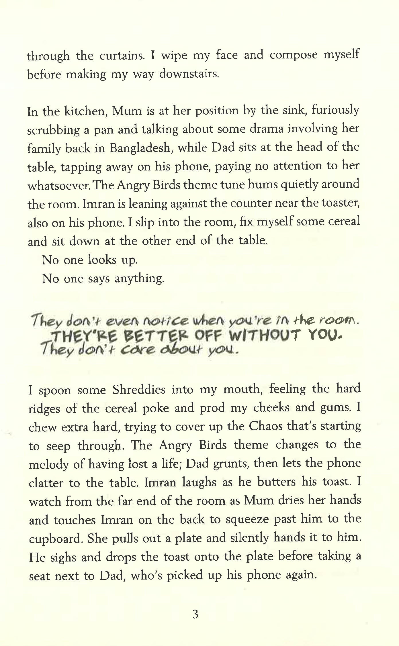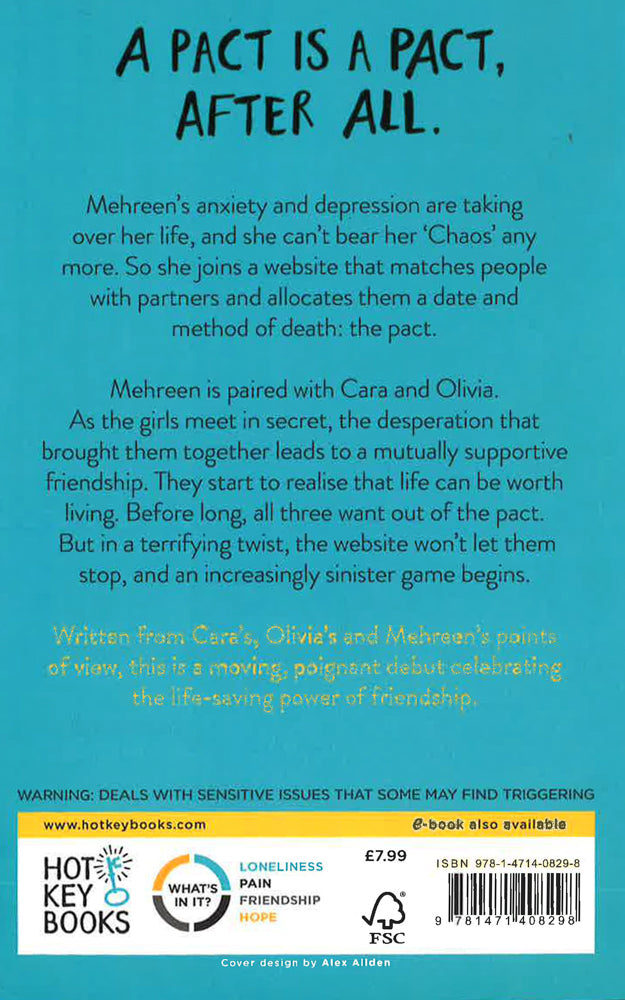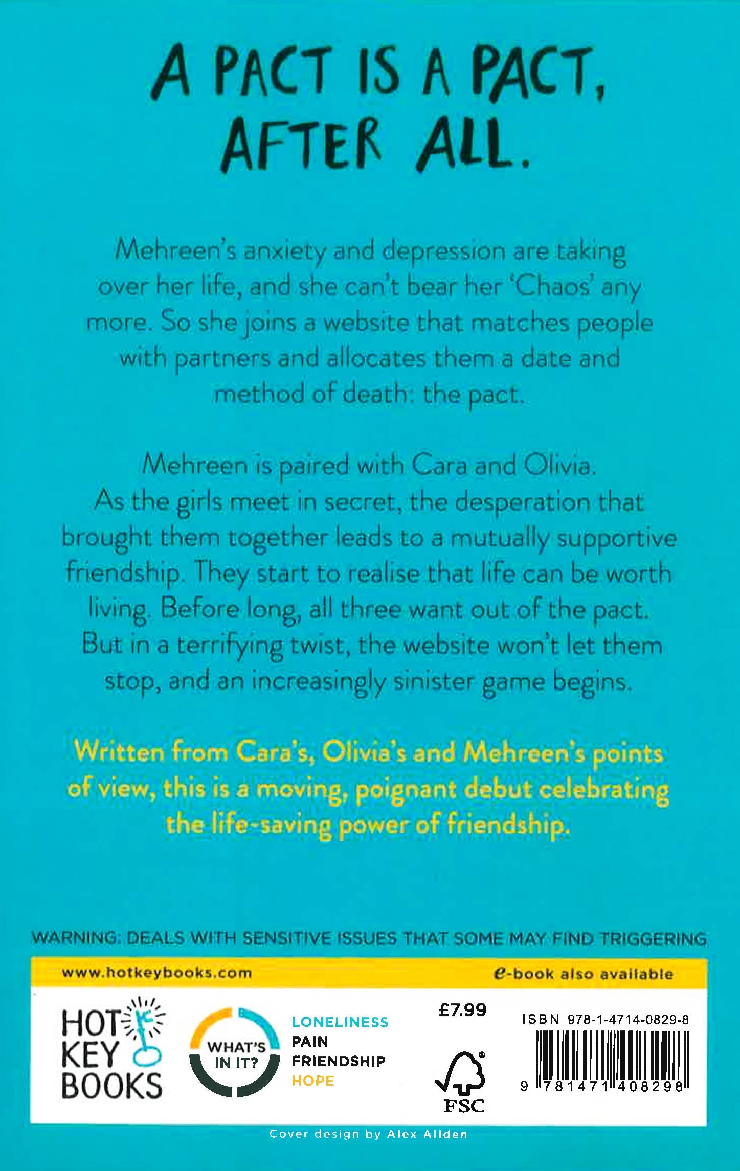 Runner-up YA in the inaugural Diverse Book Awards 2020.16-year-old Mehreen Miah's anxiety and depression, or 'Chaos', as she calls it, has taken over her life, to the point where she can't bear it any more. So she joins MementoMori, a website that matches people with partners and allocates them a date and method of death, 'the pact'. Mehreen is paired with Cara Saunders and Olivia Castleton, two strangers dealing with their own serious issues.As they secretly meet over the coming days, Mehreen develops a strong bond with Cara and Olivia, the only people who seem to understand what she's going through. But ironically, the thing that brought them together to commit suicide has also created a mutually supportive friendship that makes them realise that, with the right help, life is worth living. It's not long before all three want out of the pact. But in a terrifying twist of fate, the website won't let them stop, and an increasingly sinister game begins, with MementoMori playing the girls off against each other.A pact is a pact, after all.In this powerful debut written in three points of view, Yasmin Rahman has created a moving, poignant novel celebrating life.