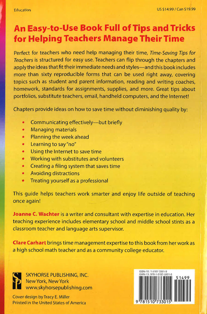 Perfect for teachers who need help managing their time,Time Saving Tips for Teachers is structured for easy use. Flip through the chapters and apply the ideas that fit immediate needs and style—and includes more than sixty reproducible forms that can be used right away, covering student and parent information, reading and writing coaches, homework, standards for assignments, and supplies, just to name a few. New tips include portfolios, substitute teachers, email, handheld computers, and the Internet!
