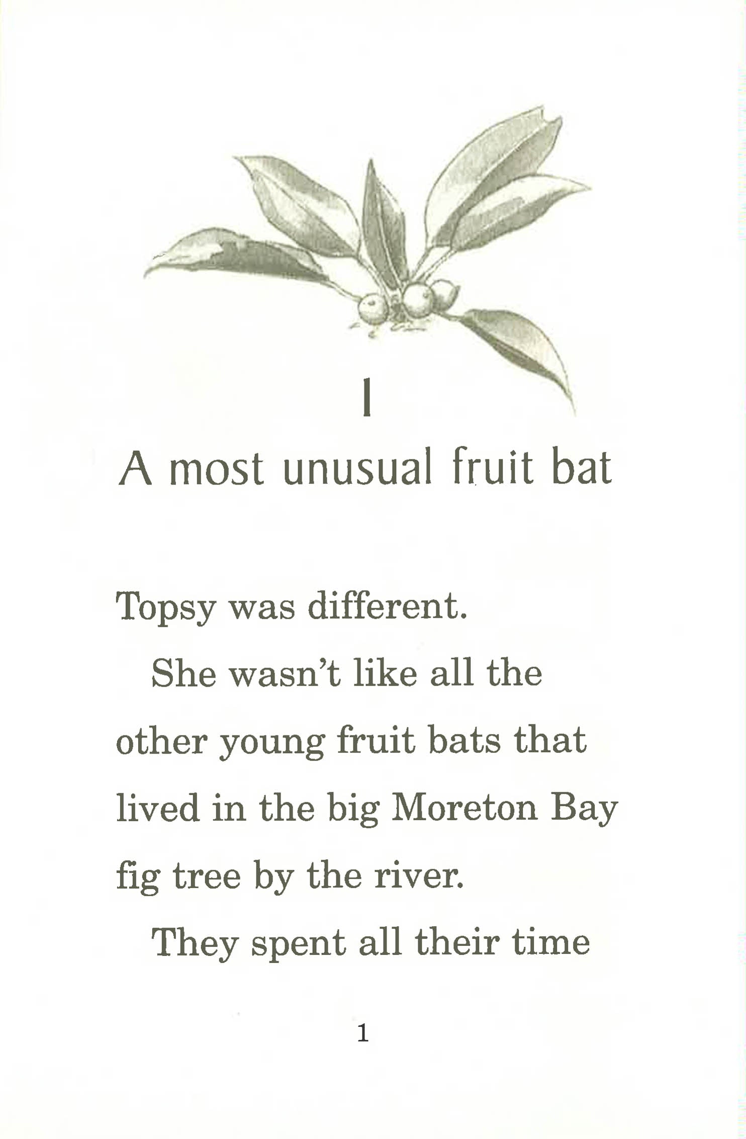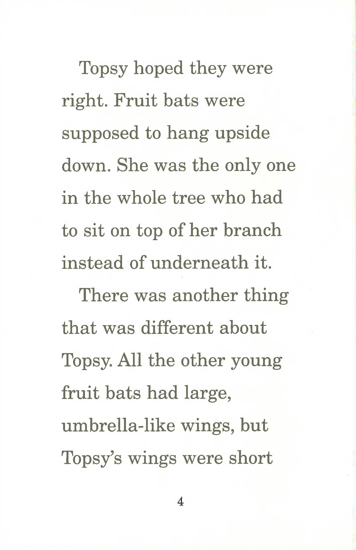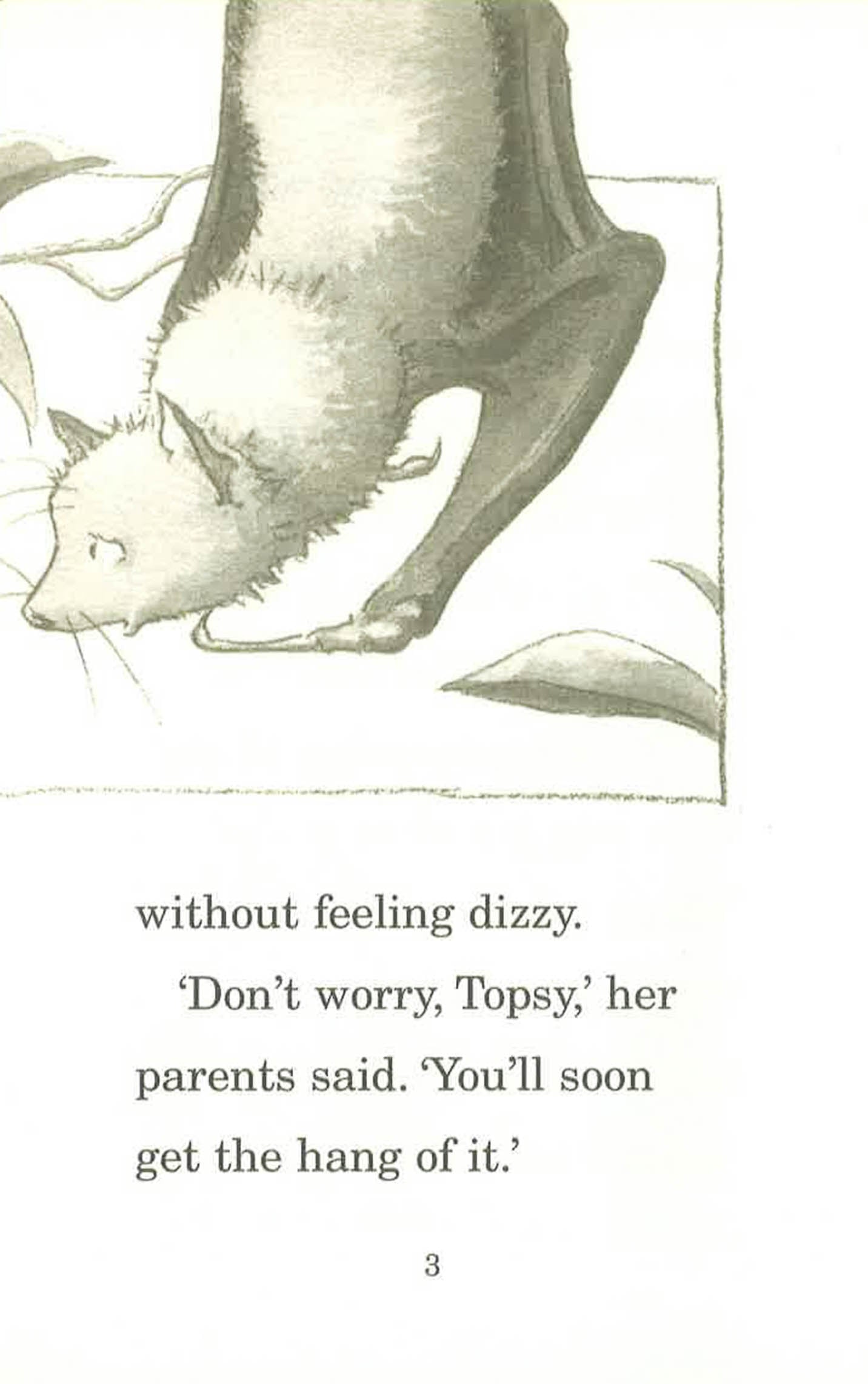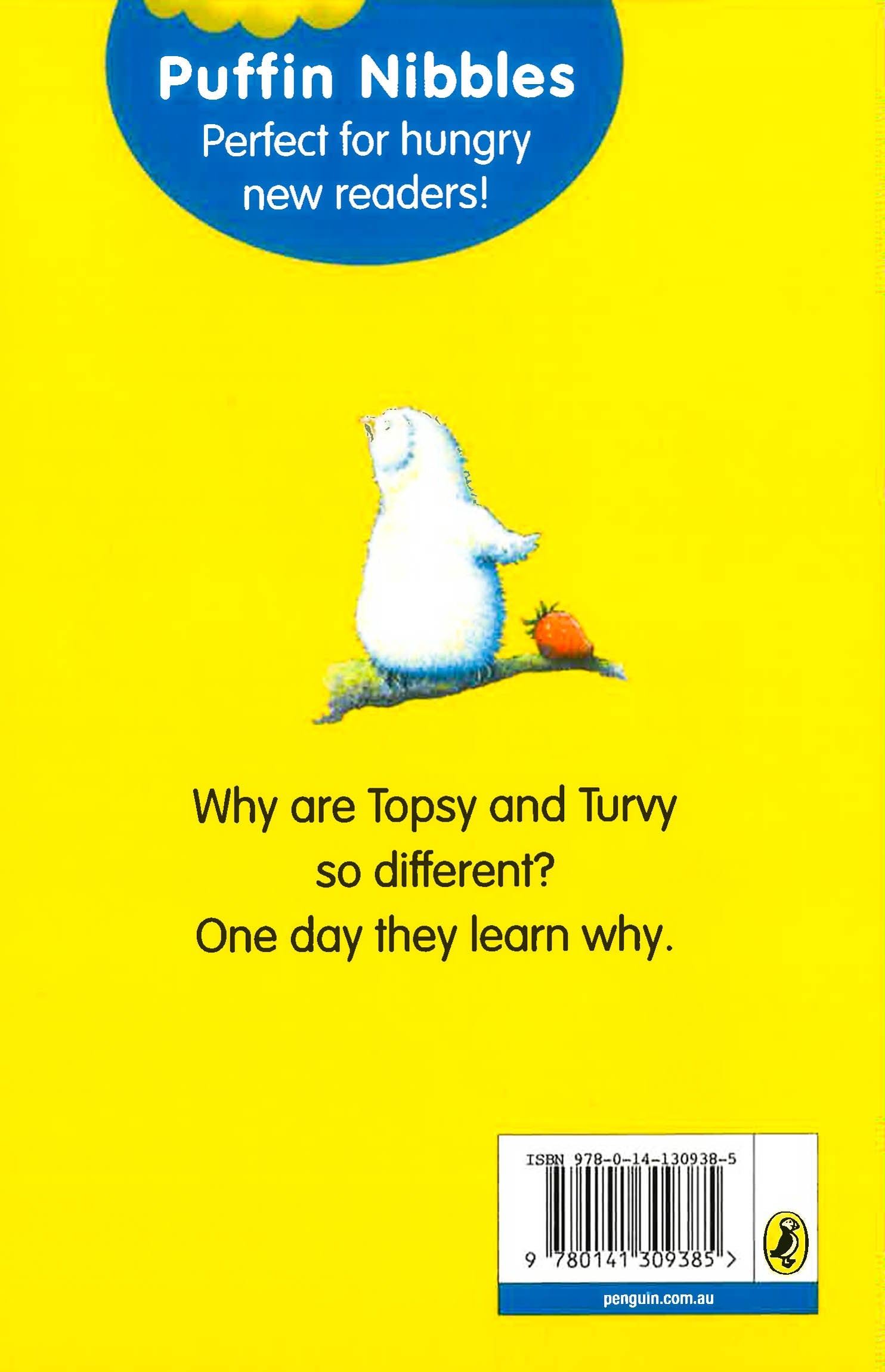 Topsy the fruit bat doesn't like fruit, and gets dizzy if she hangs upside down. Turvy the owl doesn't enjoy eating grubs, or standing on his head. When both youngsters are tipped out of their trees by a passing whirlwind, they meet each other and discover they have been accidentally swapped at birth.
