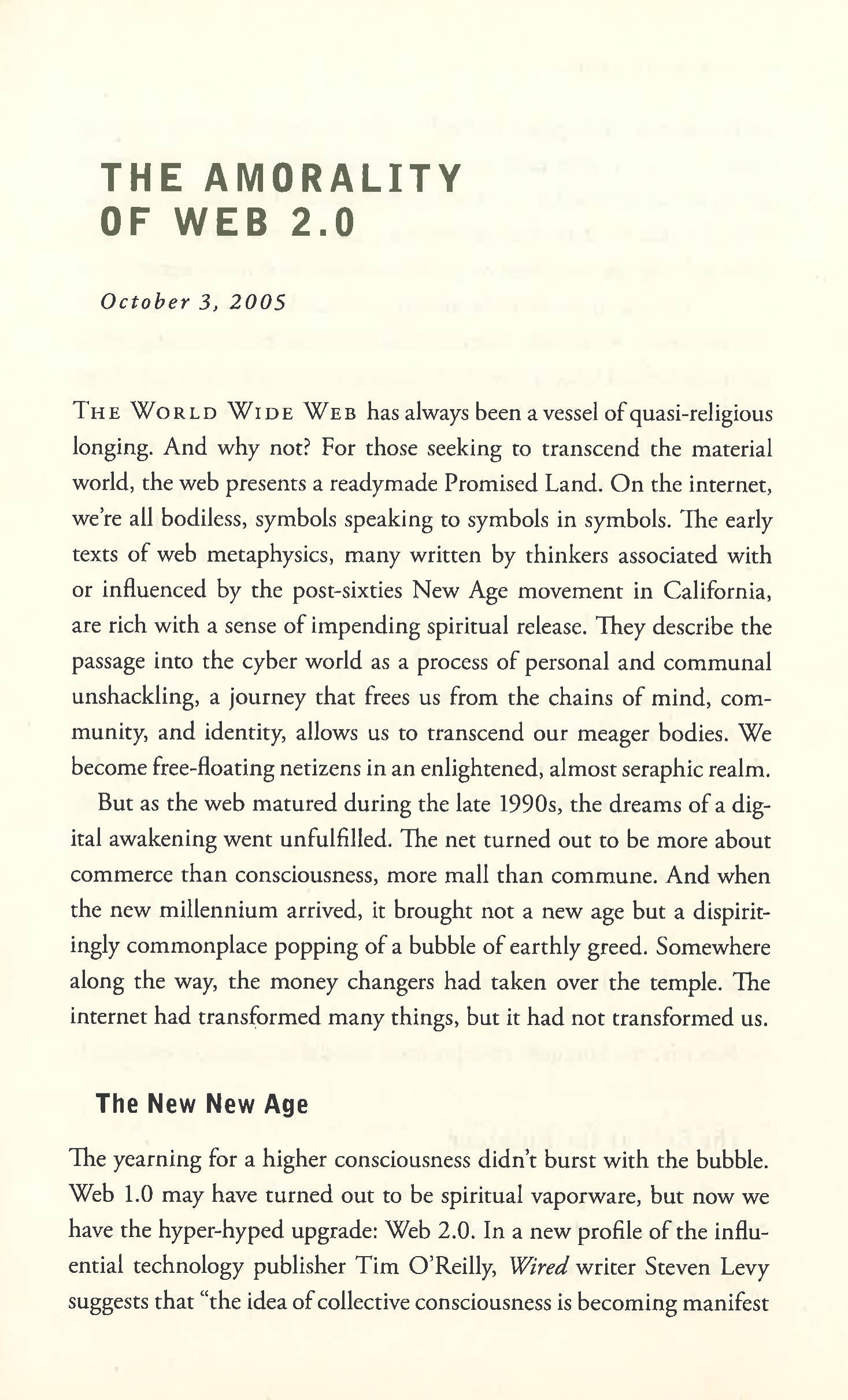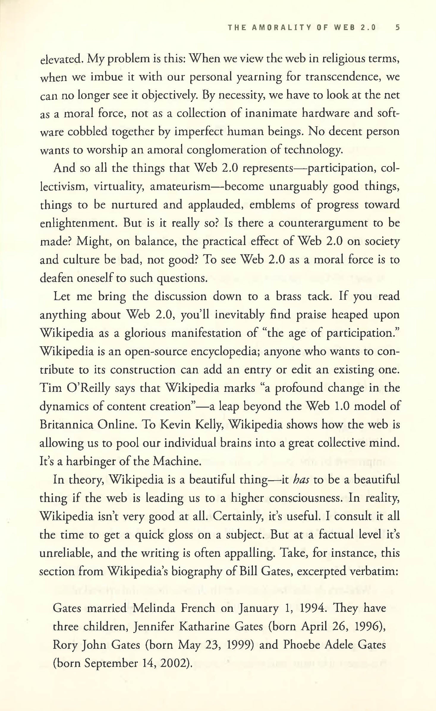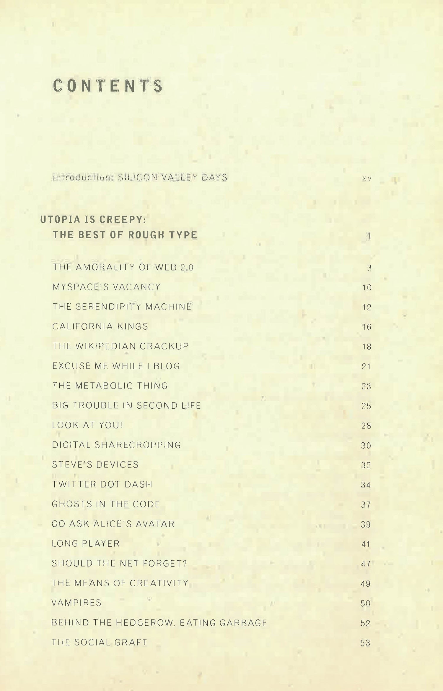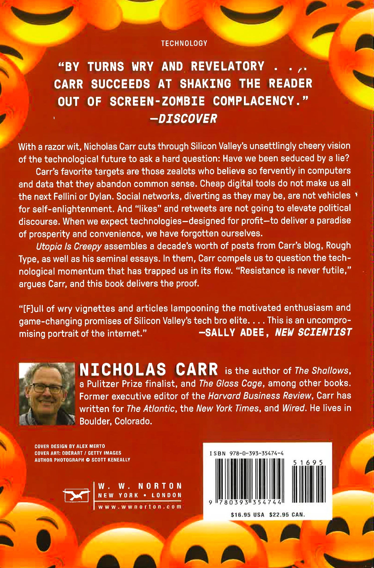 Carr draws on artists ranging from Walt Whitman to the Clash, while weaving in the latest findings from science and sociology. Carr’s favorite targets are those zealots who believe so fervently in computers and data that they abandon common sense. Cheap digital tools do not make us all the next Fellini or Dylan. Social networks, diverting as they may be, are not vehicles for self-enlightenment. And “likes” and retweets are not going to elevate political discourse. Utopia Is Creepy compels us to question the technological momentum that has trapped us in its flow. “Resistance is never futile,” argues Carr, and this book delivers the proof.