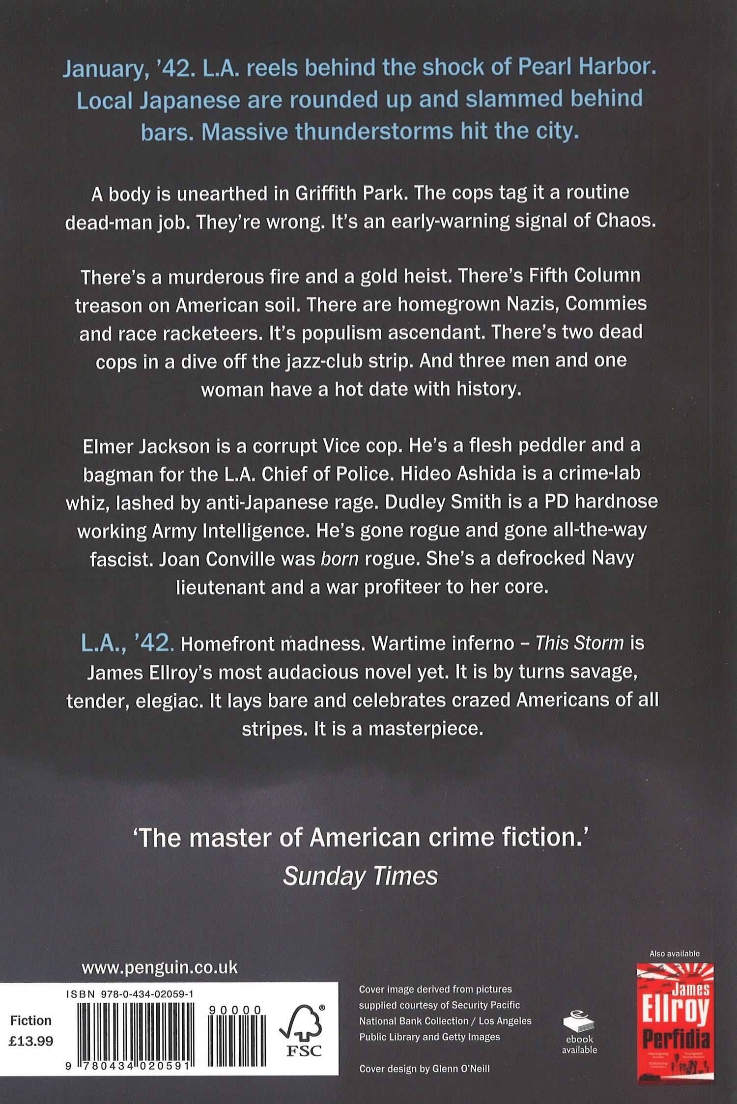 Ellroy writes with raw power undeniably one of the most influential crime writers of our time' THE TIMES'a tangled fever-dream Ellroy offers a grandiose, Wagnerian vision of wartime LA' SUNDAY TIMESA brilliant historical crime novel, set in Los Angeles and Mexico during the pulse-pounding aftermath of the attack on Pearl Harbor.January, 42. L.A. reels behind the shock of Pearl Harbor. Local Japanese are rounded up and slammed behind bars. Massive thunderstorms hit the city. A body is unearthed in Griffith Park. The cops tag it a routine dead-man job. Theyre wrong. Its an early-warning signal of Chaos. Theres a murderous fire and a gold heist exploding out of the past. Theres Fifth Column treason at this moment, on American soil. There are homegrown Nazis, commies and race racketeers. Theres two dead cops in a dive off the jazz-club strip. And three men and one woman have a hot date with History. Elmer Jackson is a corrupt Vice cop. Hes a flesh peddler and a bagman for the L.A. Chief of Police. Hideo Ashida is a crime-lab whiz, lashed by anti-Japanese rage. Dudley Smith is a PD hardnose working Army Intelligence. Hes gone rogue and gone all-the-way fascist. Joan Conville was born rogue. Shes a defrocked Navy lieutenant and a war profiteer to her core. L.A., 42. Homefront madness ascendant. Early-wartime inferno This Storm is James Ellroys most audacious novel yet. It is by turns savage, tender, elegiac. It lays bare and celebrates crazed Americans of all stripes.Epic crime writing from a master DAILY MAILEllroy is unique. There is nobody writing this way Nobody has done or is doing what he is doing BOOKMUNCH