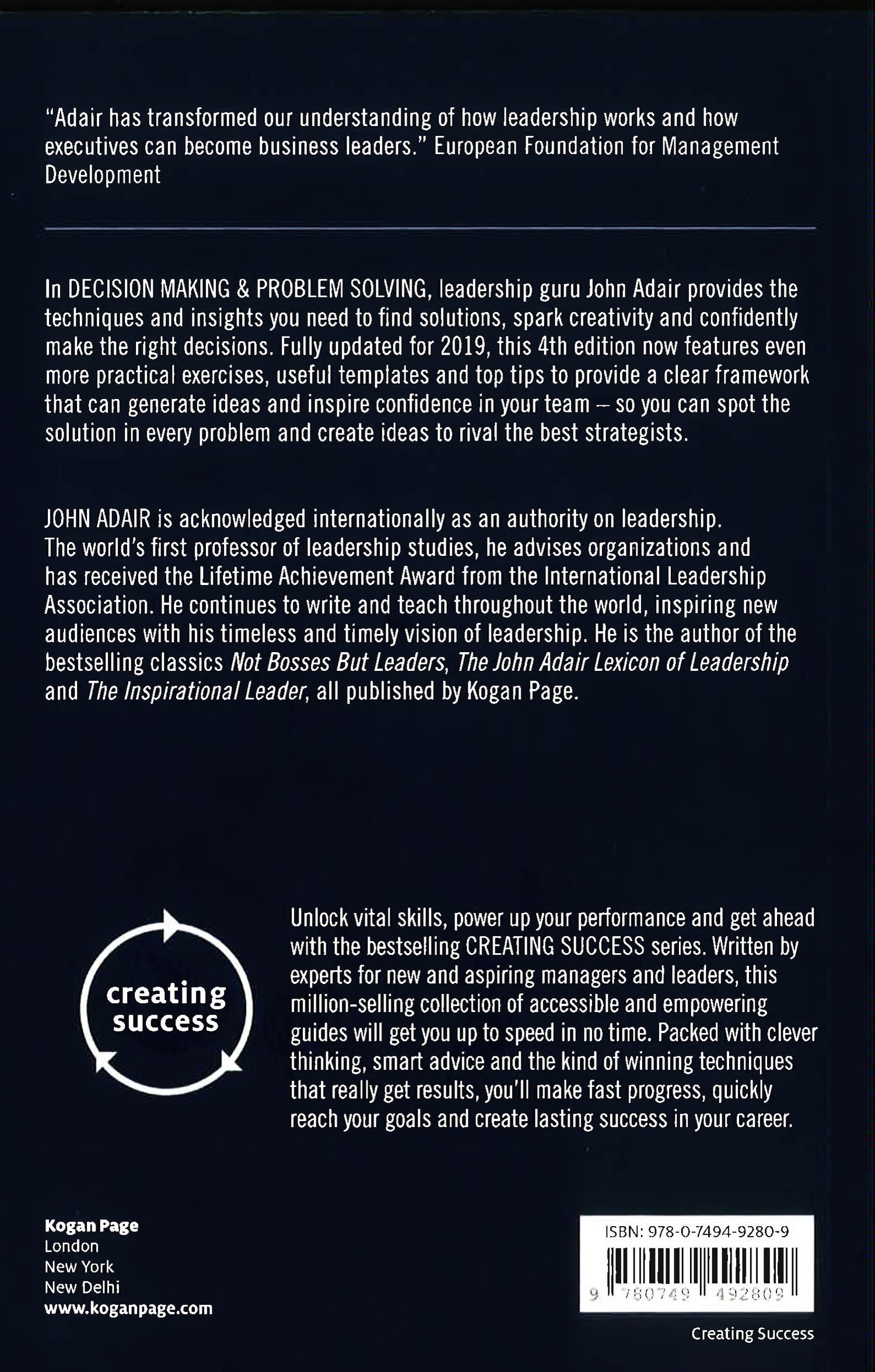 In Decision Making and Problem Solving, leadership guru John Adair provides the techniques and insights you need to find solutions, spark creativity and confidently make the right decisions. Fully updated for 2019, this 4th edition now features even more practical exercises, useful templates, and top tips to provide a clear framework that can generate ideas and inspire confidence in your team - so you can spot the solution in every problem, and create ideas to rival even the best strategists. The Creating Success series of books... Unlock vital skills, power up your performance and get ahead with the bestselling Creating Success series. Written by experts for new and aspiring managers and leaders, this million-selling collection of accessible and empowering guides will get you up to speed in no time. Packed with clever thinking, smart advice and the kind of winning techniques that really get results, you'll make fast progress, quickly reach your goals and create lasting success in your career.