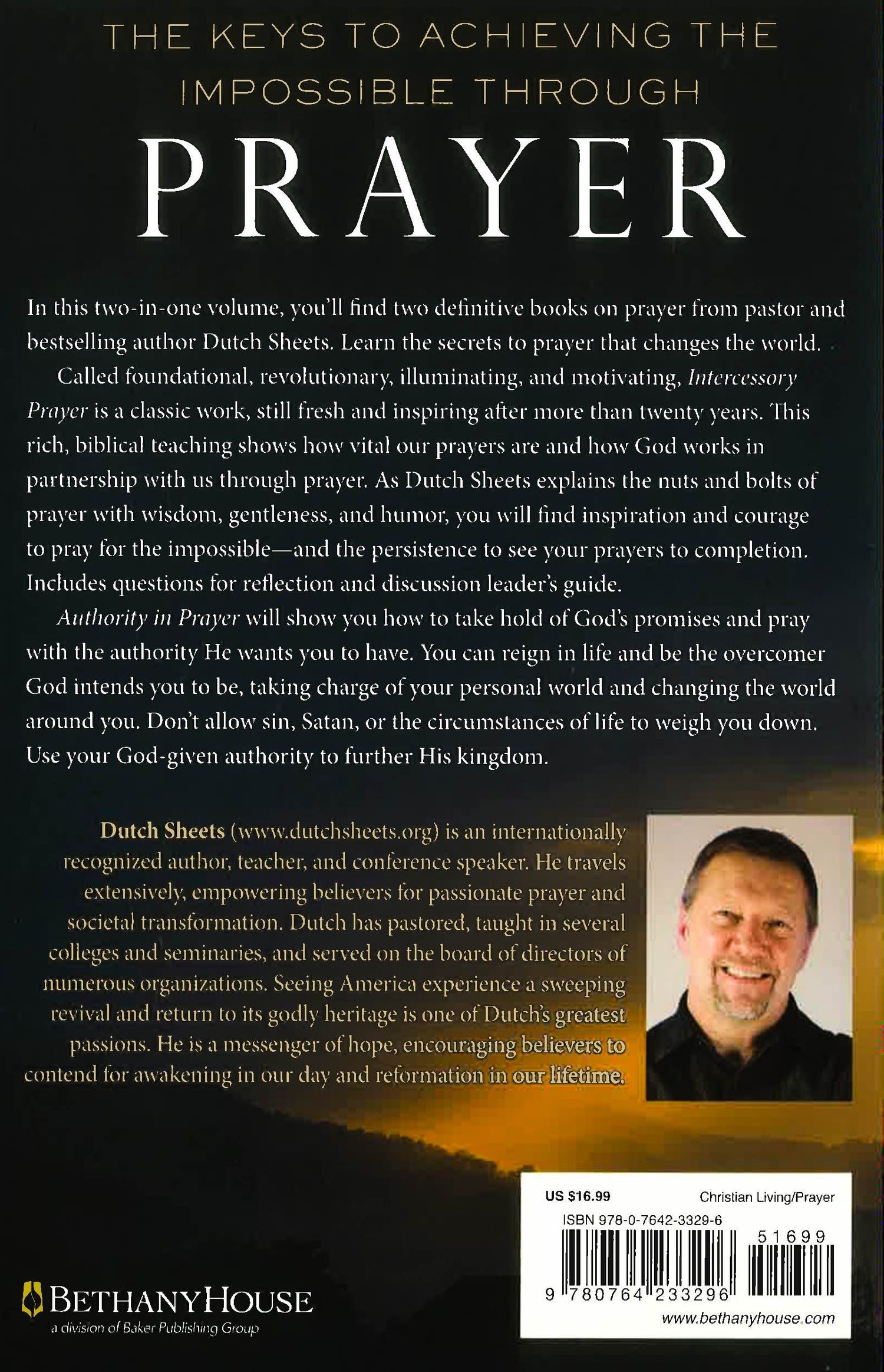 In this two-in-one volume, you'll find two definitive books on prayer from pastor and author Dutch Sheets. Called foundational, revolutionary, illuminating, and motivating, Intercessory Prayer is a classic work, still fresh and inspiring after more than 20 years. This rich, biblical teaching shows how vital our prayers are and how God works in partnership with us through prayer. As Dutch Sheets explains the nuts and bolts of prayer with wisdom, gentleness, and humor, you will find inspiration and courage to pray for the impossible--and the persistence to see your prayers to completion. Includes questions for reflection and discussion leader's guide. Authority in Prayer will show you how to take hold of God's promises and pray with the authority he wants you to have. You can reign in life and be the overcomer God intends you to be, taking charge of your personal world and changing the world around you. Don't allow sin, Satan, or the circumstances of life to weigh you down.