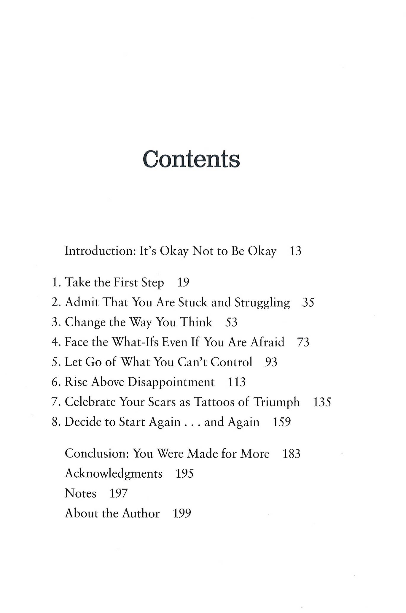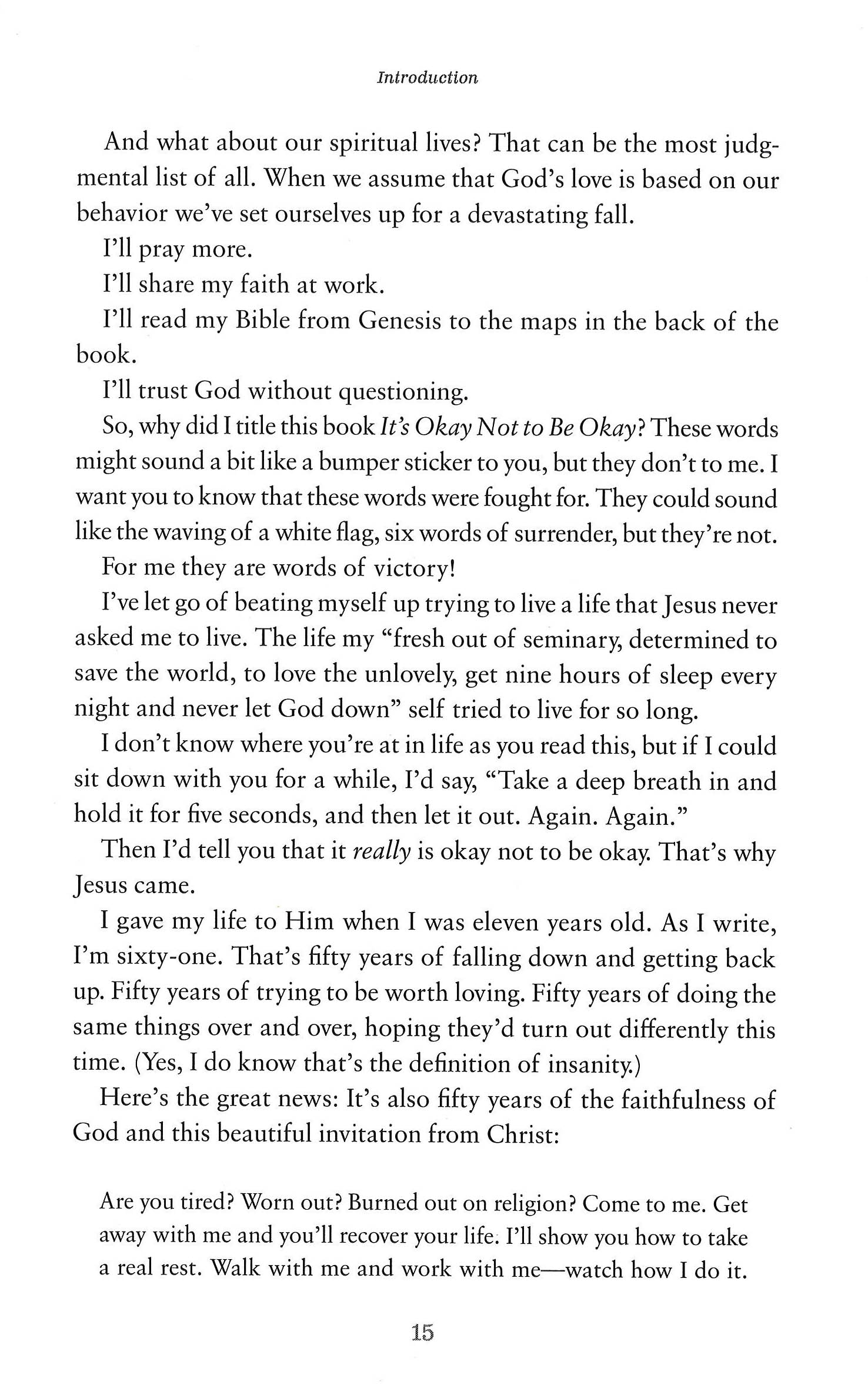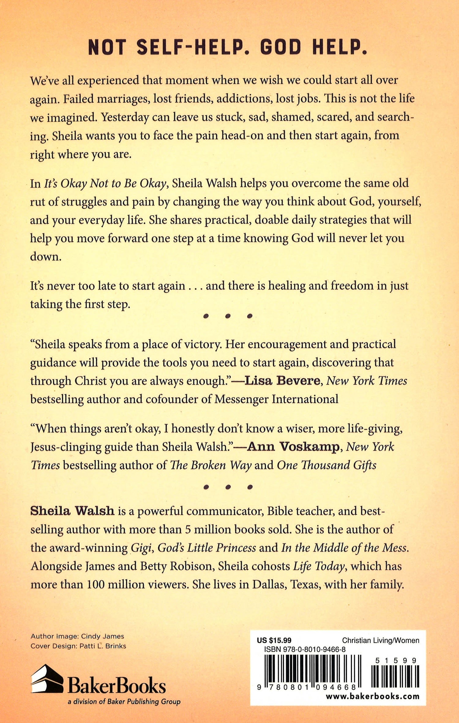 We've all experienced that moment where we wish we could start all over again. Failed marriages, lost friends, addictions, lost jobs. This is not the life we imagined. Yesterday can sometimes leave us stuck, sad, shamed, scared, and searching. Sheila Walsh encourages readers to face the pain head on and then start again, from right where they are. She shares that when she discovered "I'm not good enough and I'm good with that," everything started to change. In It's Okay Not to Be Okay, Walsh helps women overcome the same old rut of struggles and pain by changing the way they think about God, themselves, and their everyday lives. She shares practical, doable, daily strategies that will help women move forward one step at a time knowing God will never let them down.