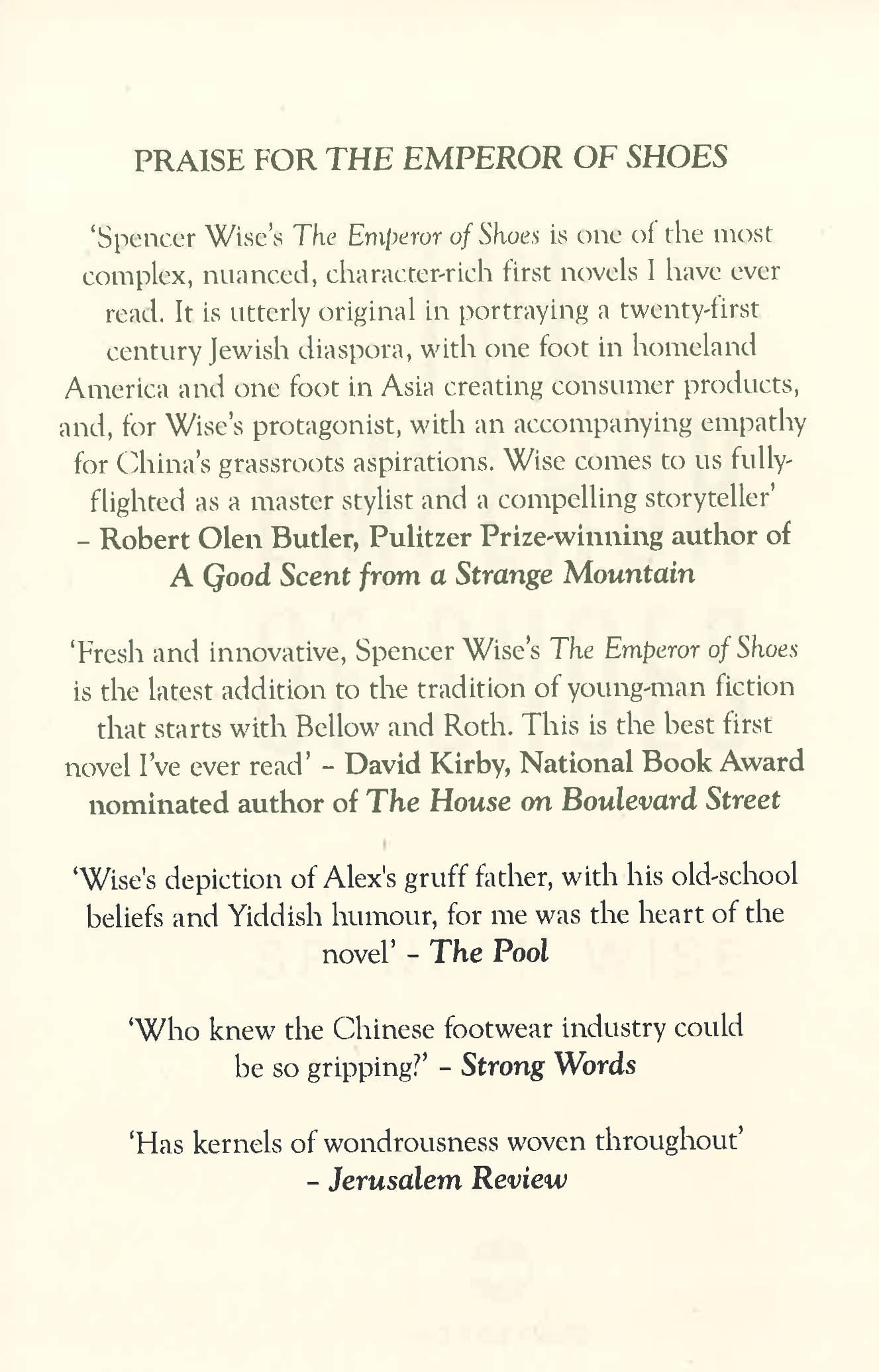 Deftly plotted and vibrantly drawn, The Emperor of Shoes is a timely meditation on idealism, ambition, father-son rivalry and cultural revolution, set against a vivid backdrop of social and technological reform.