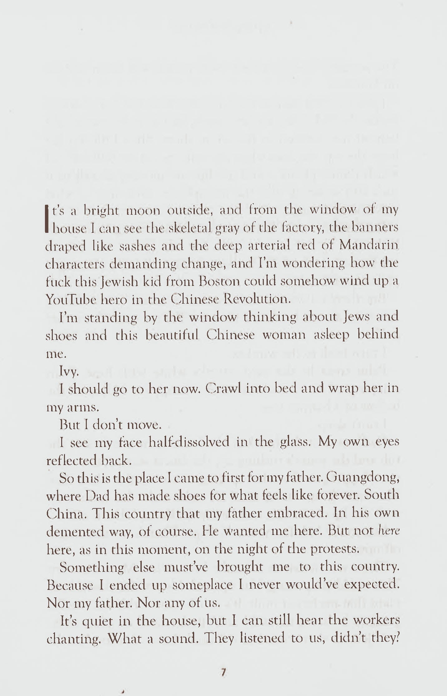 Alex Cohen, a twenty-six-year-old Jewish Bostonian, is living in southern China, where his father runs their family-owned shoe factory. Alex reluctantly assumes the helm of the company, but as he explores the plant's vast floors and assembly lines, he comes to a grim realisation: employees are exploited, regulatory systems are corrupt and Alex's own father is engaging in bribes to protect the bottom line. When Alex meets a seamstress named Ivy, his sympathies begin to shift. She is an embedded organiser of a pro-democratic Chinese party, secretly sowing dissonance among her fellow labourers. Will Alex remain loyal to his father and his heritage? Or will the sparks of revolution ignite?