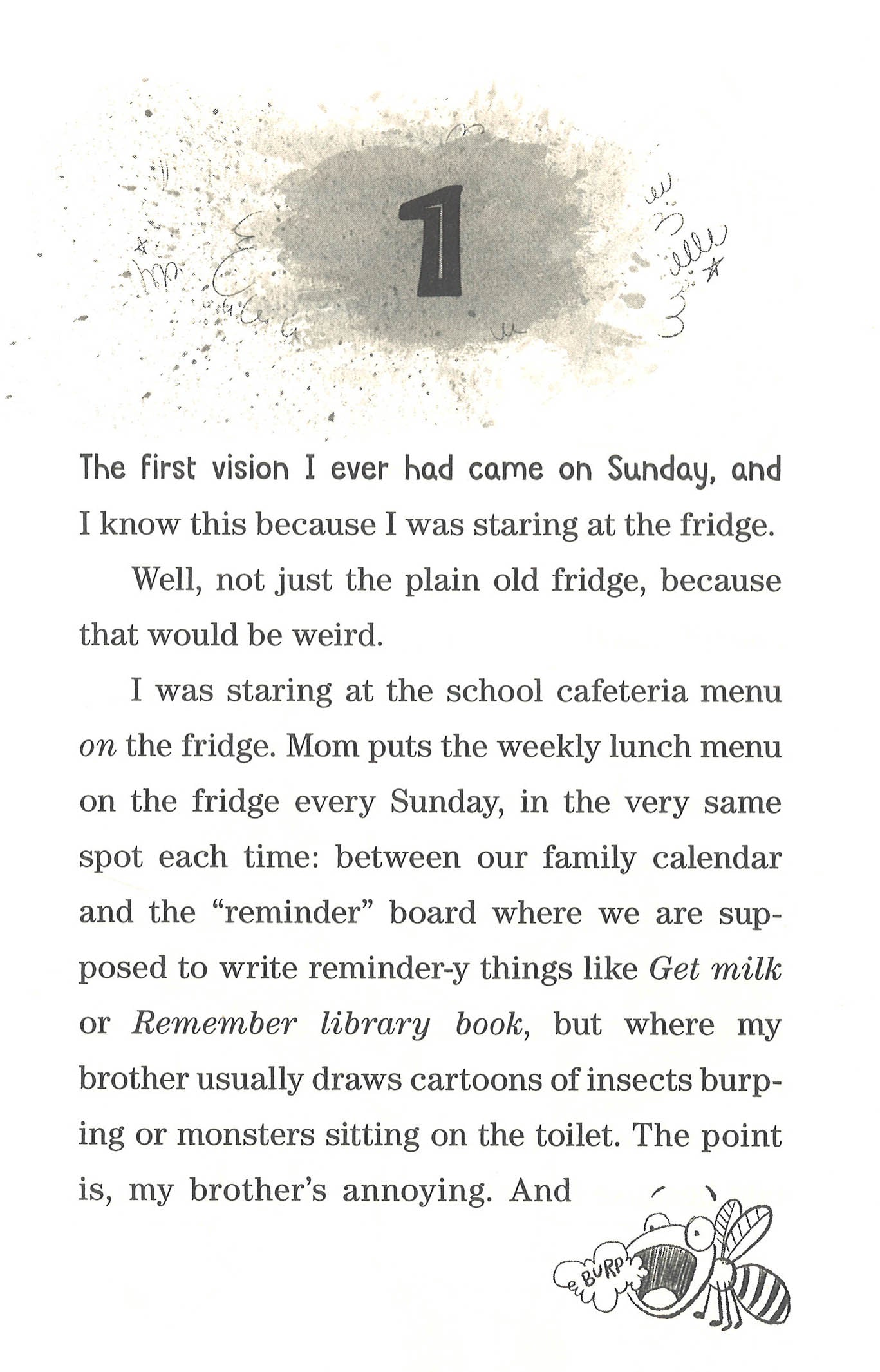 One perfectly ordinary afternoon, a vision flashes through third-grader Hazel "Hazy" Bloom's mind--of flying peas. The next day in the school cafeteria, a food fight erupts that involves the very same airborne veggie. After one or two more seemingly silly visions come true in unexpected ways, Hazy realizes she has a strange new power: twenty-four hours before trouble occurs, she receives a visual clue about what's going to happen.