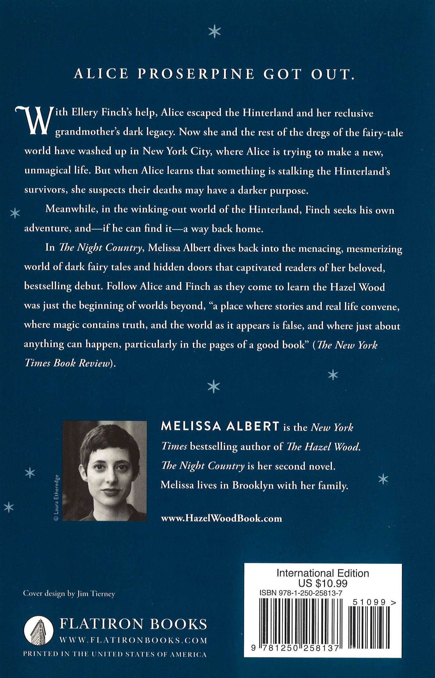 In The Night Country, Alice Proserpine dives back into a menacing, mesmerizing world of dark fairy tales and hidden doors of The Hazel Wood. Follow her and Ellery Finch as they learn The Hazel Wood was just the beginning, and that worlds die not with a whimper, but a bang.