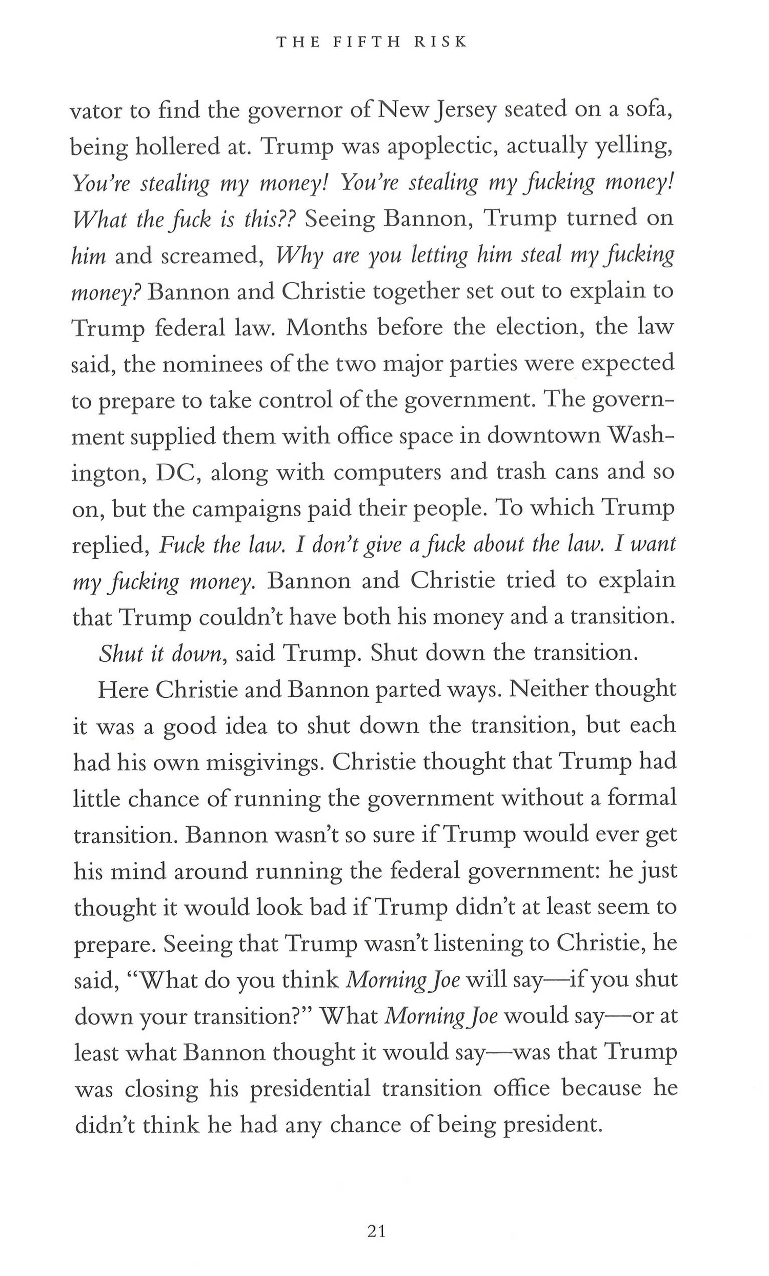 "The election happened," remembers Elizabeth Sherwood-Randall, then deputy secretary of the Department of Energy. "And then there was radio silence." Across all departments, similar stories were playing out: Trump appointees were few and far between; those that did show up were shockingly uninformed about the functions of their new workplace. Some even threw away the briefing books that had been prepared for them. Michael Lewis's brilliant narrative takes us into the engine rooms of a government under attack by its own leaders. In Agriculture the funding of vital programs like food stamps and school lunches is being slashed. The Commerce Department may not have enough staff to conduct the 2020 Census properly. Over at Energy, where international nuclear risk is managed, it's not clear there will be enough inspectors to track and locate black market uranium before terrorists do. Willful ignorance plays a role in these looming disasters. If your ambition is to maximize short-term gains without regard to the long-term cost, you are better off not knowing those costs. If you want to preserve your personal immunity to the hard problems, it's better never to really understand those problems. There is upside to ignorance, and downside to knowledge. Knowledge makes life messier. It makes it a bit more difficult for a person who wishes to shrink the world to a worldview. If there are dangerous fools in this book, there are also heroes, unsung, of course. They are the linchpins of the system-those public servants whose knowledge, dedication, and proactivity keep the machinery running. Michael Lewis finds them, and he asks them what keeps them up at night.