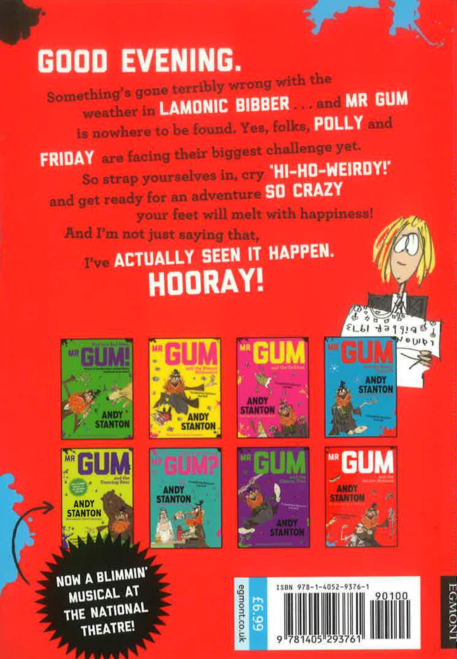 Good evening. Talking parrots in the rooftops? A giant cactus on the high street? Mosquitos so nasty that even their own friends don't like them? Something's gone terribly wrong in Lamonic Bibber ... and Mr Gum is nowhere to be found. Yes, folks, Polly and Friday are facing their biggest challenge yet. So strap yourselves in, cry 'HI-HO-WEIRDY!' and get ready for an adventure so crazy your feet will melt with happiness! And I'm not just saying that, I've actually seen it happen. HOORAY!