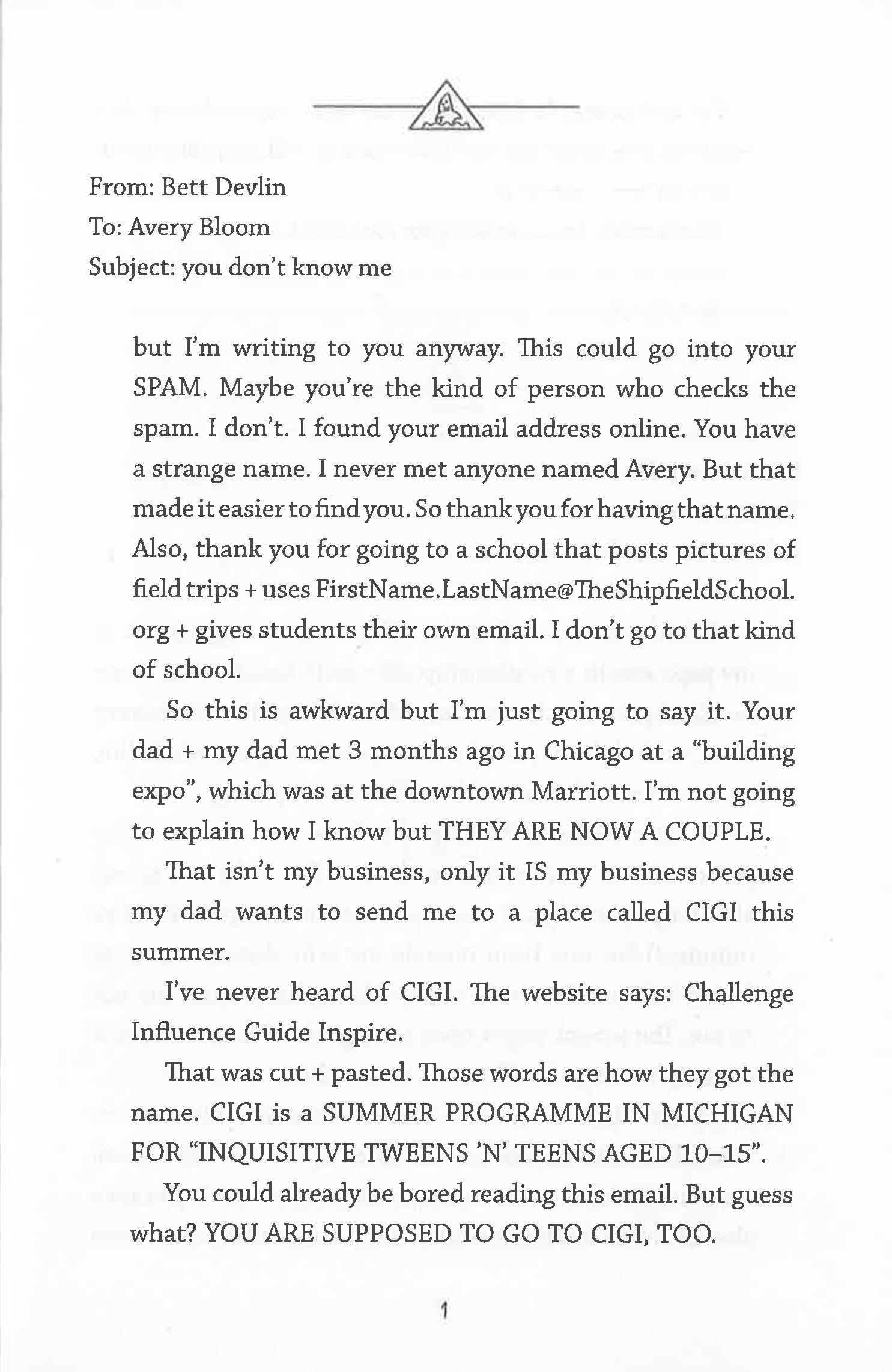 Avery (Night Owl) is bookish, intense, likes to plan ahead, and is afraid of many things. Bett (Dogfish) is fearless, outgoing, and lives in the moment. What they have in common is that they are both twelve years old, and their dads are dating each other.