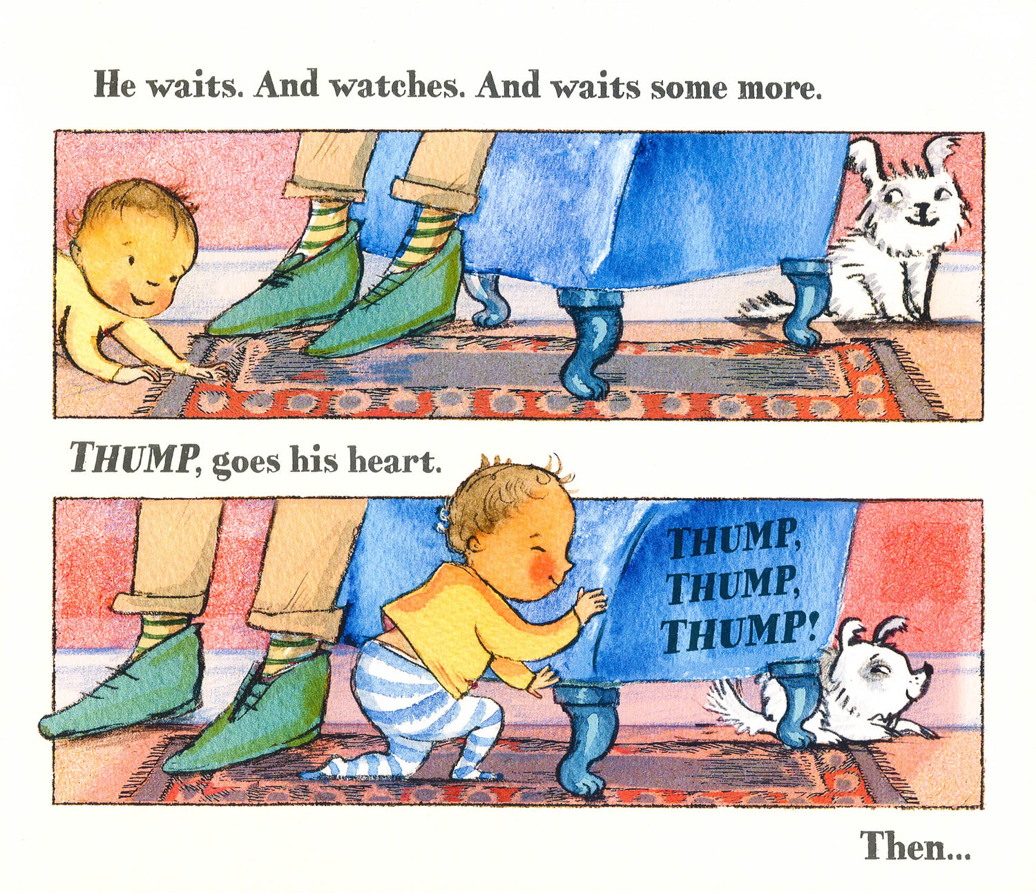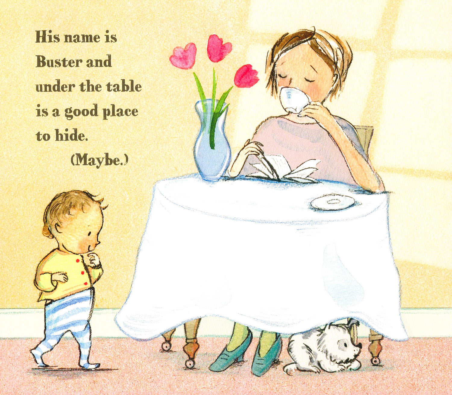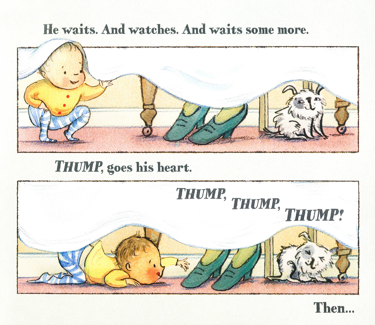 In the little red house, Buster the dog ducks under the table. He waits and watches and waits some more as his heart goes thump, thump, thump. And then ... CHAAA! Out of the shadows comes the baby, squealing and whirling and bumping his nose! Go Buster! Go, Buster! Go!