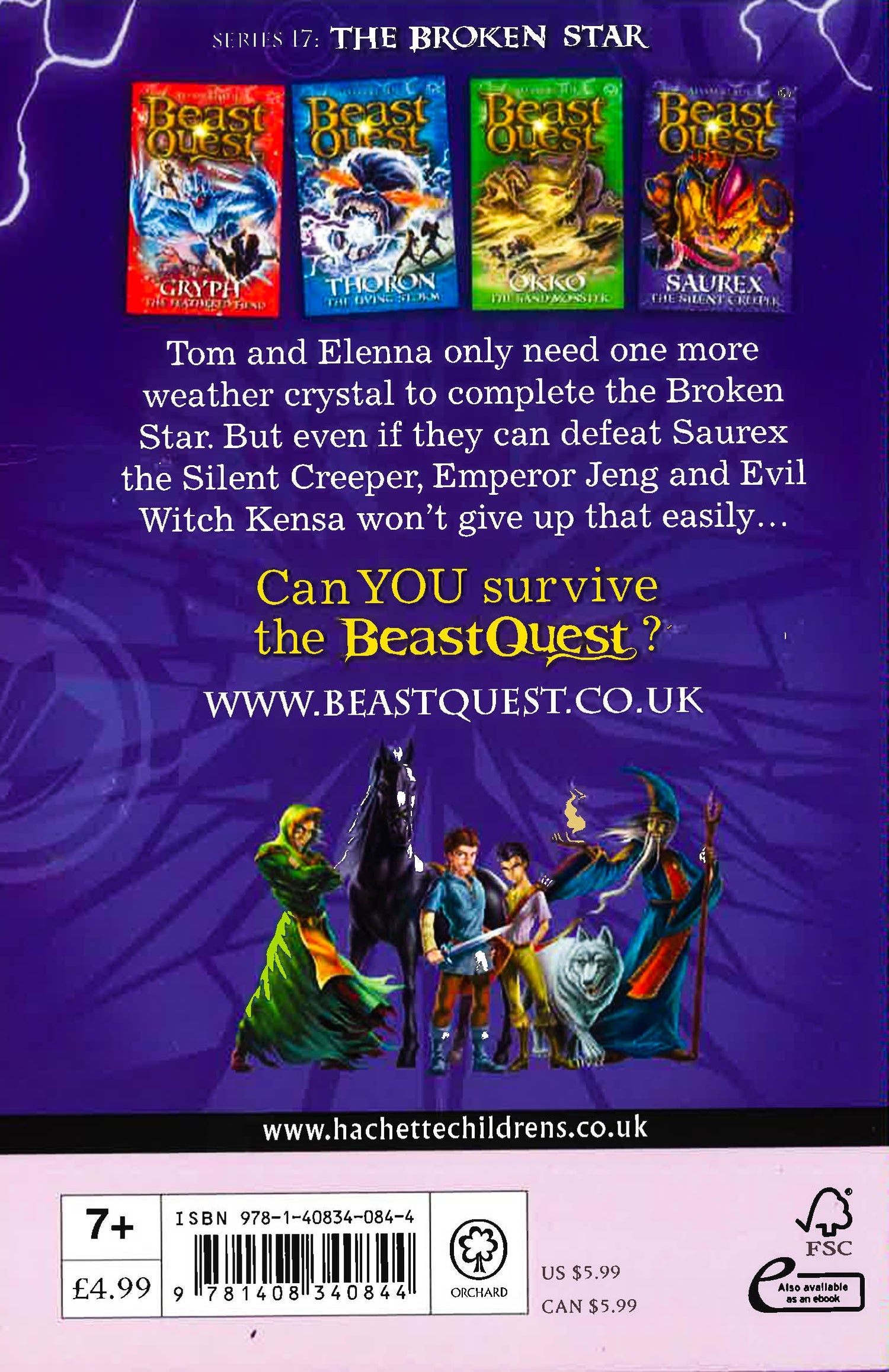 There are FOUR thrilling adventures to collect in the Beast Quest: The Broken Star series: Gryph the Feathered Fiend; Thoron the Living Storm; Okko the Sand Monster; Saurex the Silent Creeper.