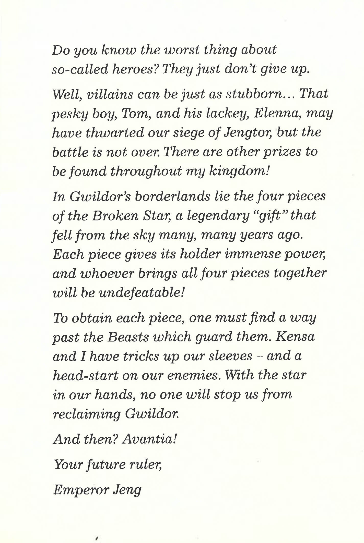 Tom and Elenna only need one more weather crystal to reform the Broken Star. But even if they can defeat Saurex the Silent Creeper,Emperor Jeng and Evil Witch Kensa won't give up that easily...