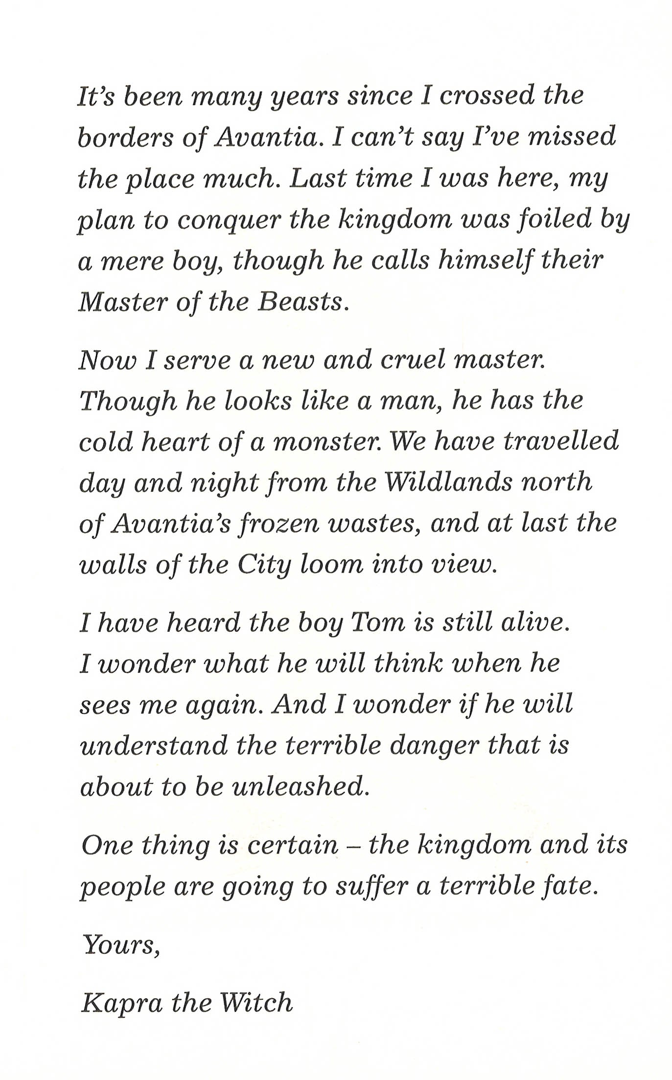 Back in Avantia from their exile in the Wildlands, Tom and Elenna face their deadliest enemy yet. Can they fight the ghoulish Beast Xerkan - and reveal the truth about the mysterious Prince Angelo before the kingdom of Avantia is changed for ever?