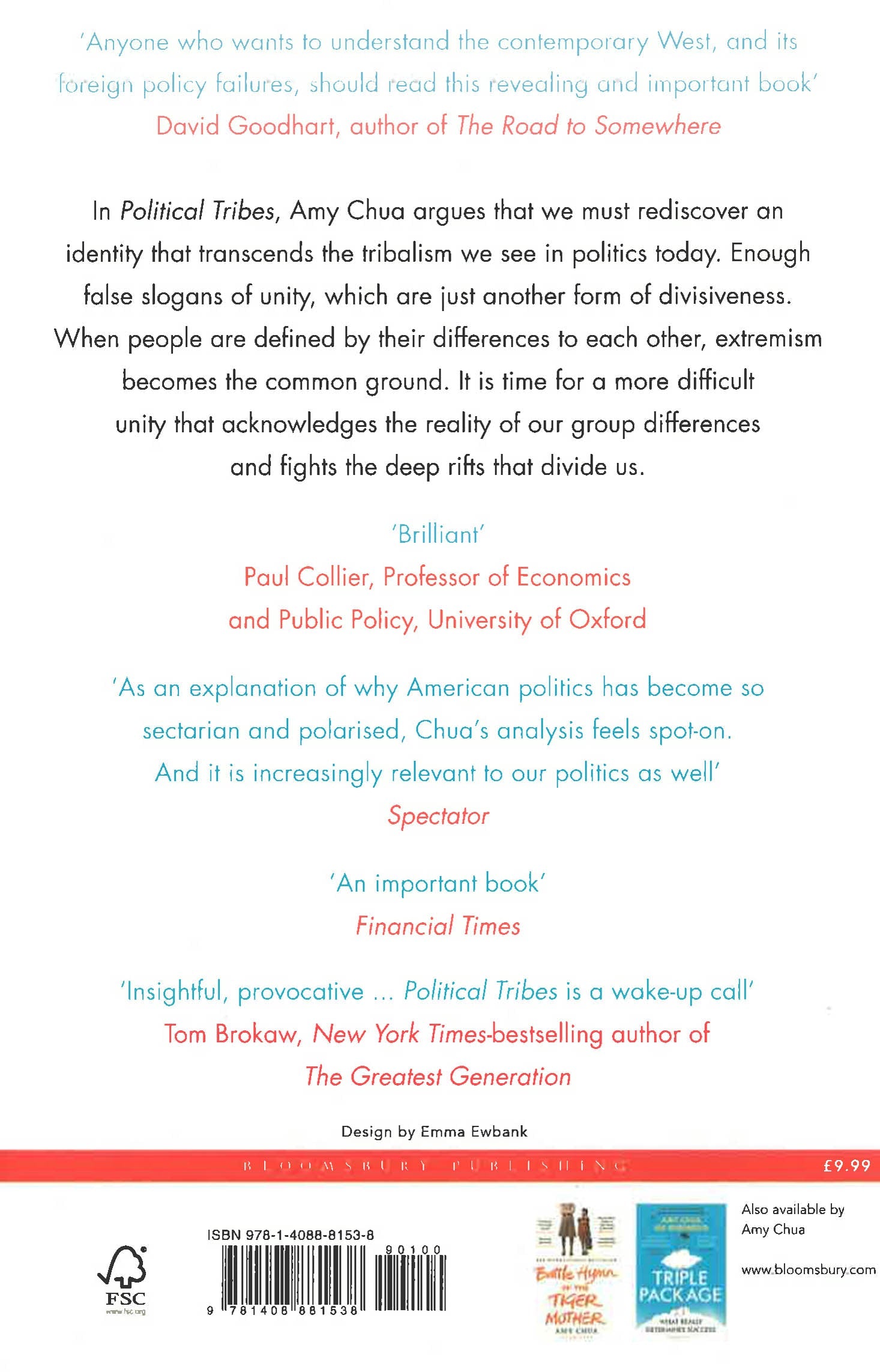 'A beautifully written, eminently readable and uniquely important challenge to conventional wisdom' J. D. Vance, author of Hillbilly Elegy 'A page-turner and revelation, Political Tribes will change the way you think' Tim Wu, author of The Attention Merchants In Political Tribes, Amy Chua argues that we must rediscover an identity that transcends the tribalism we see in politics today. Enough false slogans of unity, which are just another form of divisiveness. When people are defined by their differences to each other, extremism becomes the common ground. It is time for a more difficult unity that acknowledges the reality of our group differences and fights the deep rifts that divide us.