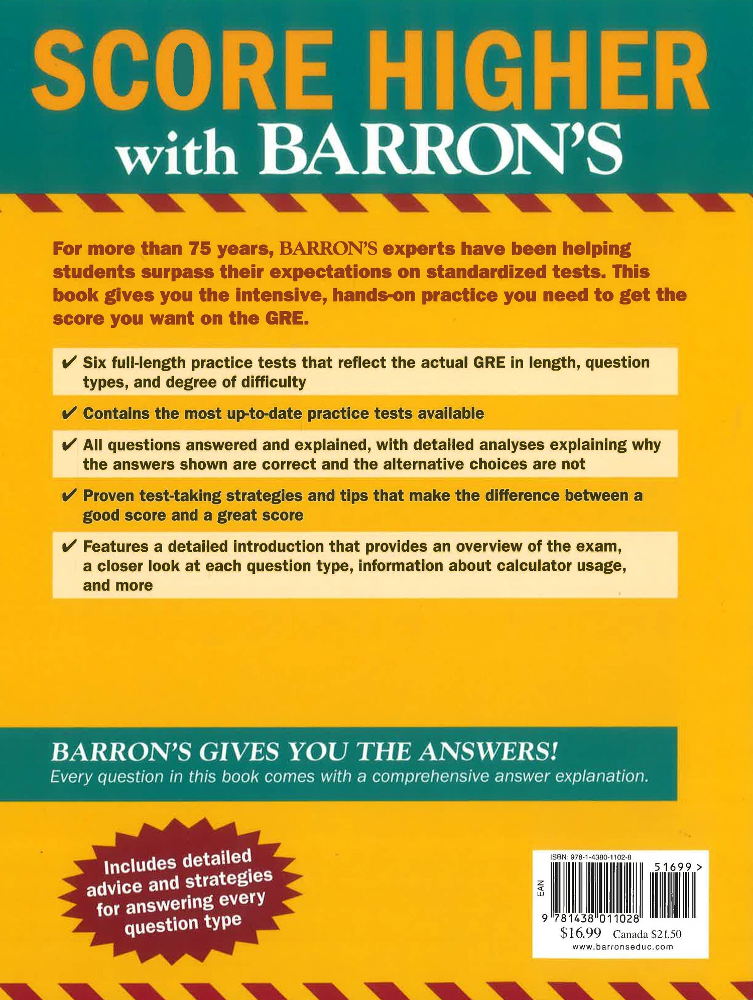 This book offers excellent test preparation when used alone and also makes a fine companion when used along with Barron's GRE with Bonus Online Practice Tests, 22nd Edition (978-1-4380-0915-5).