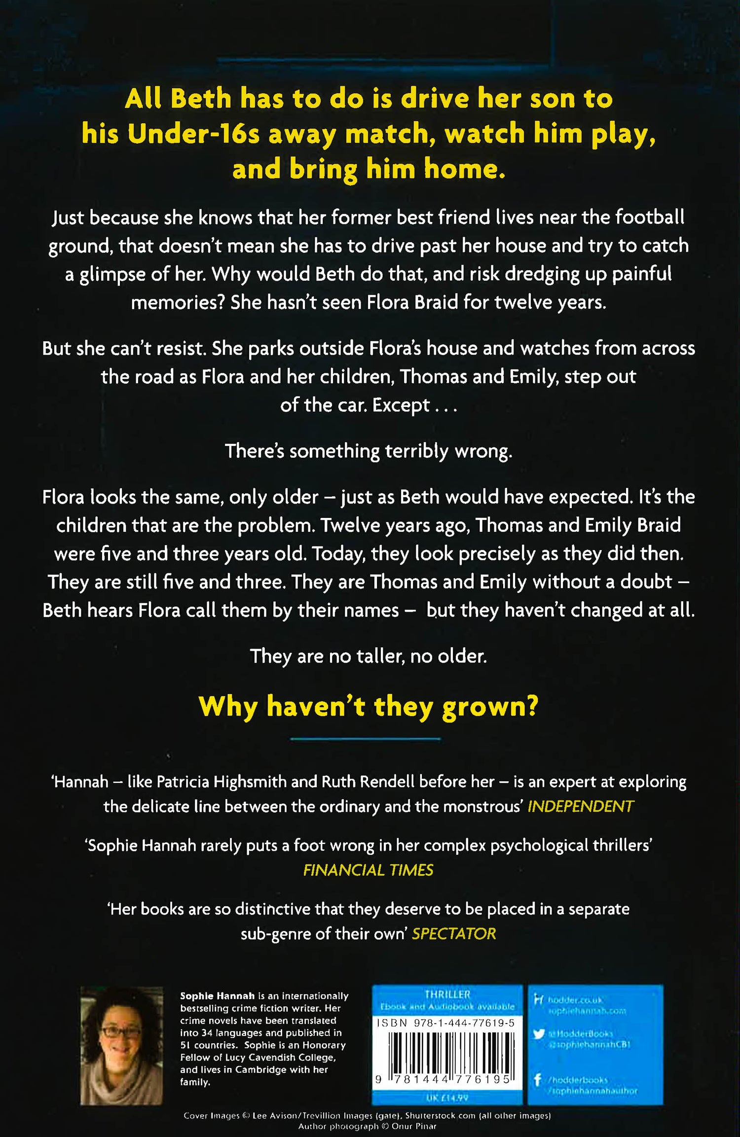 Flora looks the same, only older - just as Beth would have expected. It's the children that are the problem. Twelve years ago, Thomas and Emily Braid were five and three years old. Today, they look precisely as they did then. They are still five and three. They are Thomas and Emily without a doubt - Beth hears Flora call them by their names - but they haven't changed at all.