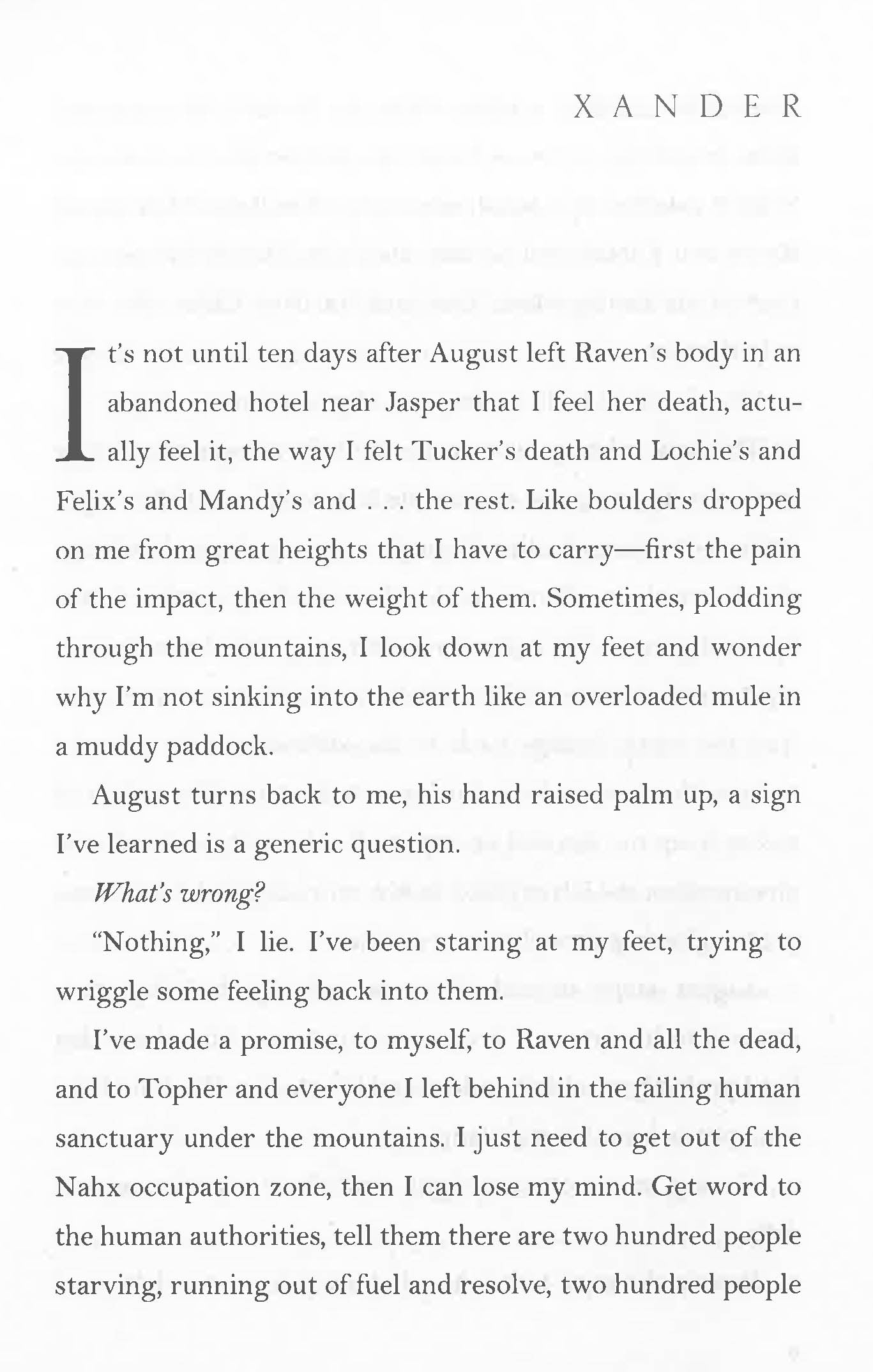 Xander Liu survived the end of the world-just barely. For more than a year he has outsmarted, hidden from, and otherwise avoided the ruthless alien invaders, the Nahx, dodging the deadly darts that have claimed so many of his friends. When the murder of his friend Raven leaves him in the protective company of August, a rebellious Nahx soldier, Xander is finally able to make his way back to human controlled territory and relative safety.
