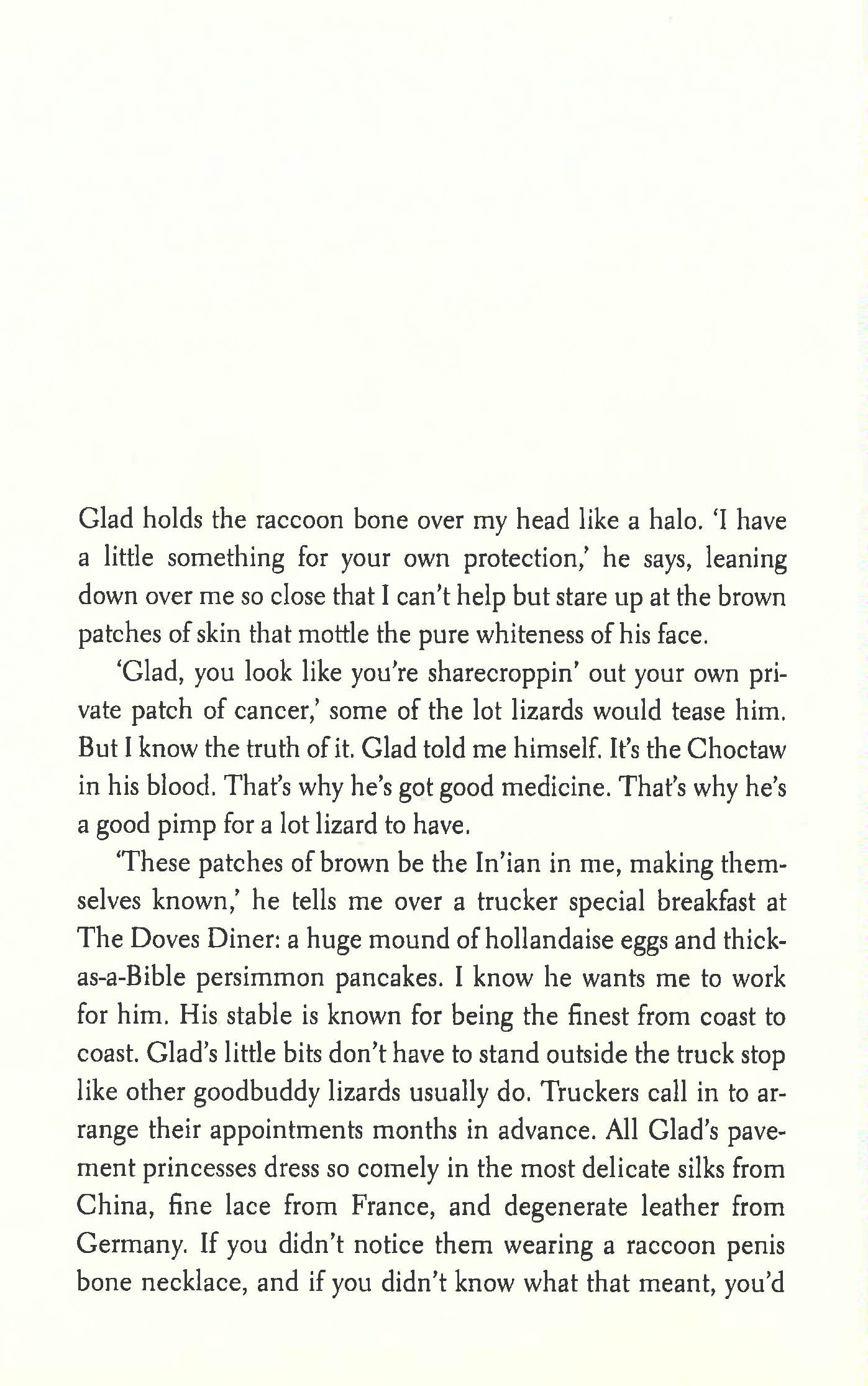 Sarah never admits that she's his mother, but the beautiful boy has watched her survive as a "lot lizard": a prostitute working the West Virginia truck stops. Desperate to win her love, he decides to surpass her as the best and most famous lot lizard ever. With his own leather mini-skirt and a makeup bag that closes with Velcro, the young "Cherry Vanilla" embarks on a journey through the Appalachian wilds, dining on transcendental cuisine, supplicating to the mystical Jackalope, encountering the most terrifying of pimps, walking on water, being venerated as an innocent girl saint - and then being denounced as the devil.