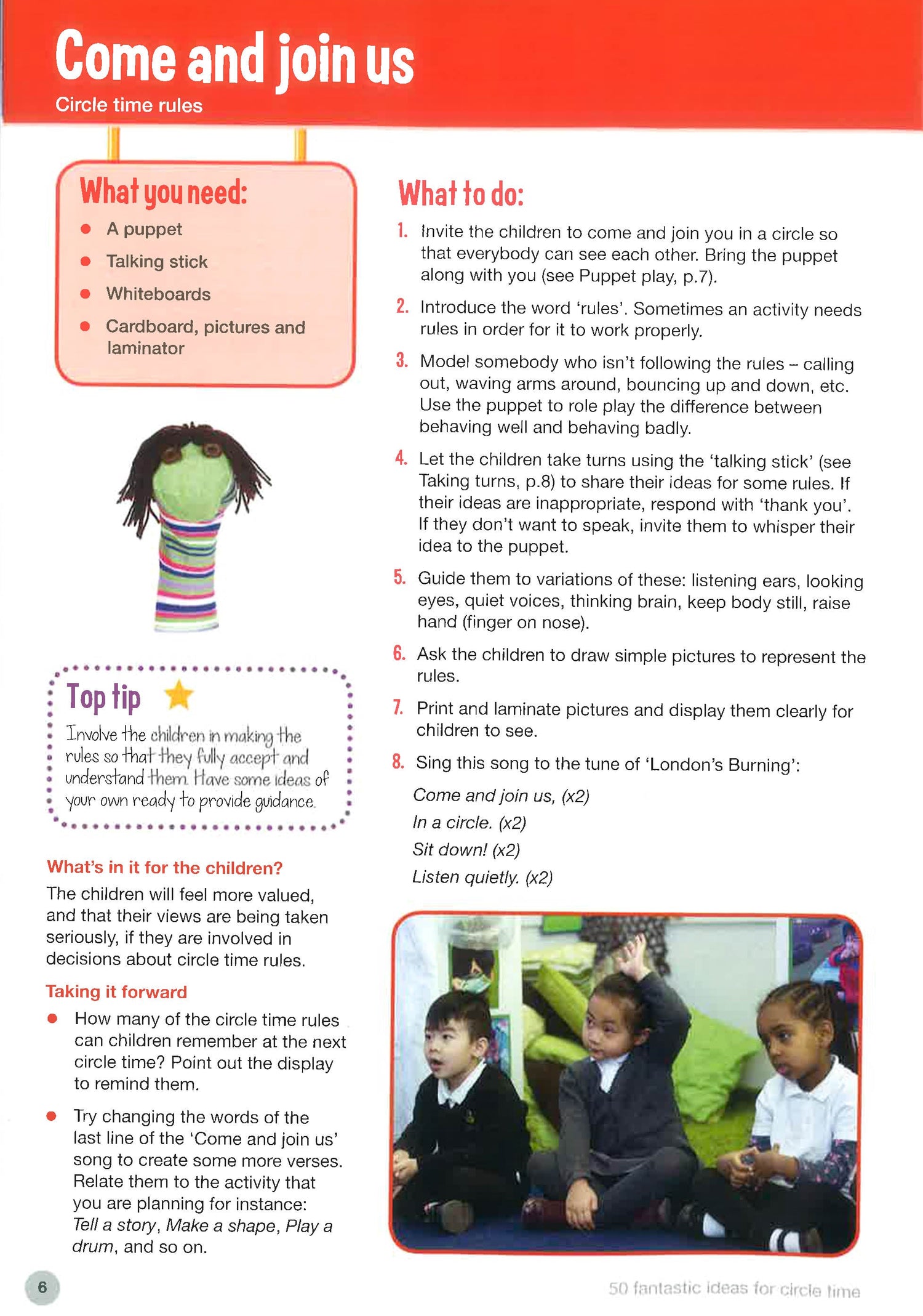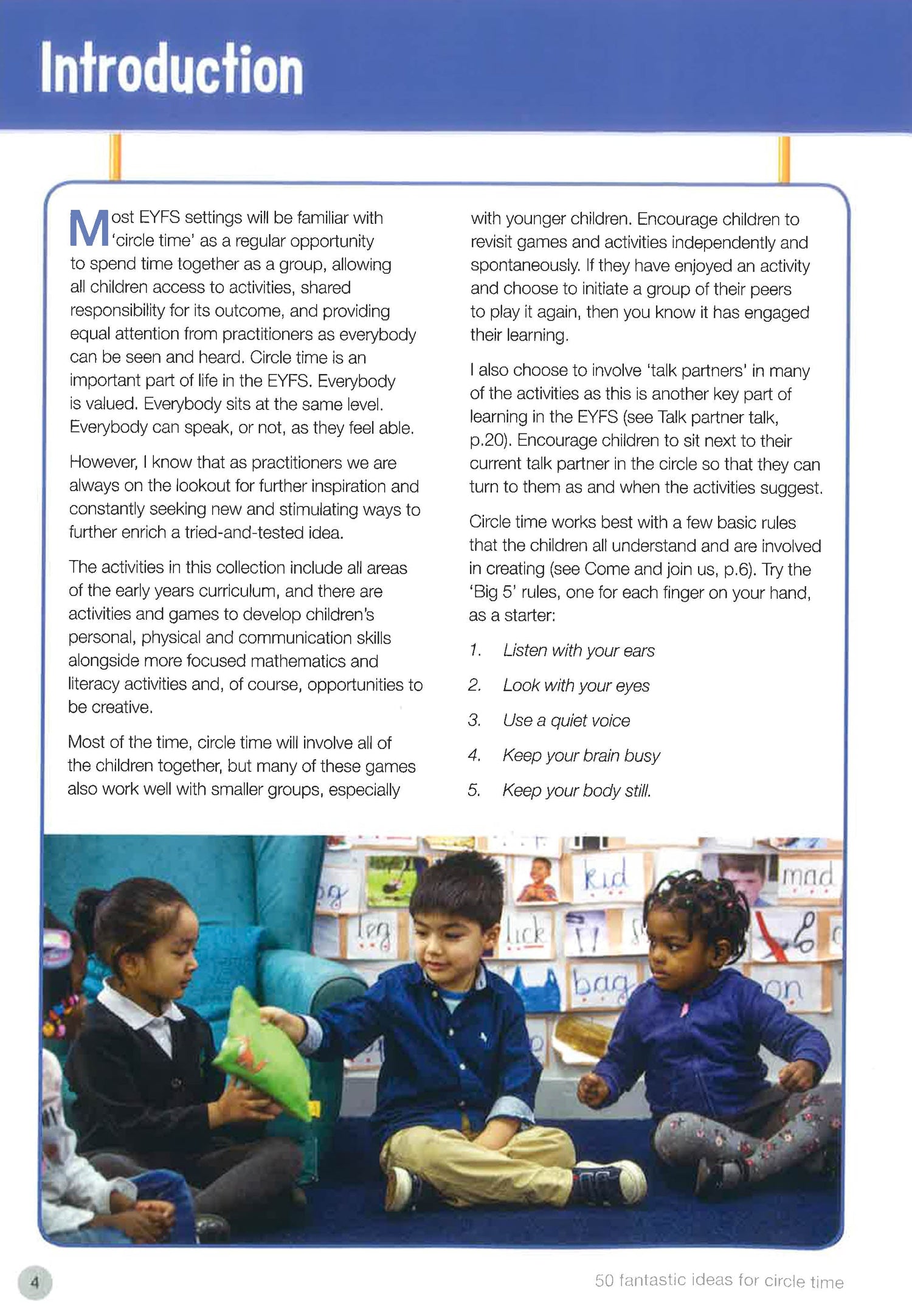 Circle time stimulates learning in all areas of development - from the improvement of social skills and positive relationships to encouraging children to listen to each other within a caring and respectful environment. Judith Harries brings together creative ideas for circle time where learning can be shared and music and drama can be enjoyed. The book includes circle time activities and games that cover all of the Early Learning Goals through the sharing of thoughts, feelings and experiences. It can also be used across the curriculum, including helping children with literacy and mathematics through phonics and number games. This timeless collection of ideas featuring colourful and fun photography is a fantastic resource with many new activities for circle time, as well as some old favourites.