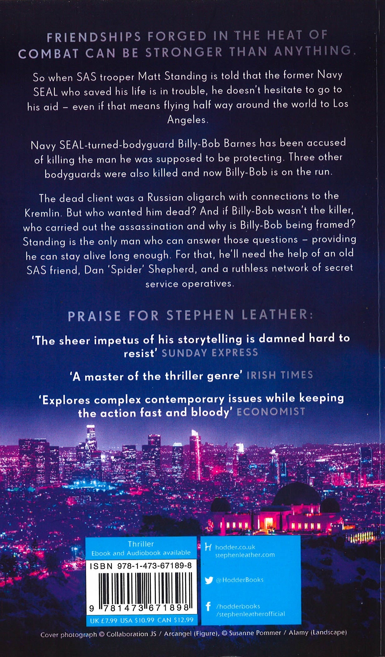 Friendships forged in the heat of combat can be stronger than anything.So when SAS trooper Matt Standing is told that the former Navy SEAL who saved his life is in trouble, he doesn't hesitate to go to his aid - even if that means flying half way around the world to Los Angeles.Navy SEAL-turned-bodyguard Bobby-Ray Barnes has been accused of killing the man he was supposed to be protecting. Three other bodyguards were also killed and now Bobby-Ray is on the run.The dead client was a Russian oligarch with connections to the Kremlin. But who wanted him dead? And if Bobby-Ray wasn't the killer, who carried out the assassination and why is Bobby-Ray being framed? Standing is the only man who can answer those questions - providing he can stay alive long enough. For that he'll need the help of an old SAS friend, Dan 'Spider' Shepherd, and a ruthless network of secret service operatives. Praise for bestselling author Stephen Leather'The sheer impetus of his storytelling is damned hard to resist' Sunday Express'A master of the thriller genre' Irish Times'As tough as British thriller writers get' Irish Independent